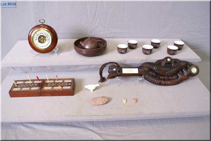 Selection of collectibles including hard carved paddle, barometer, arrow heads,inlaid cribbage box and Oriental pottery