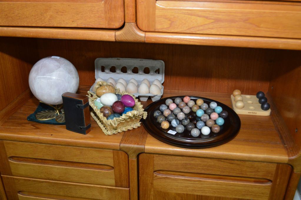 Selection of collectibles including pink quartz globe, gemstone eggs, marble solitaire game etc.