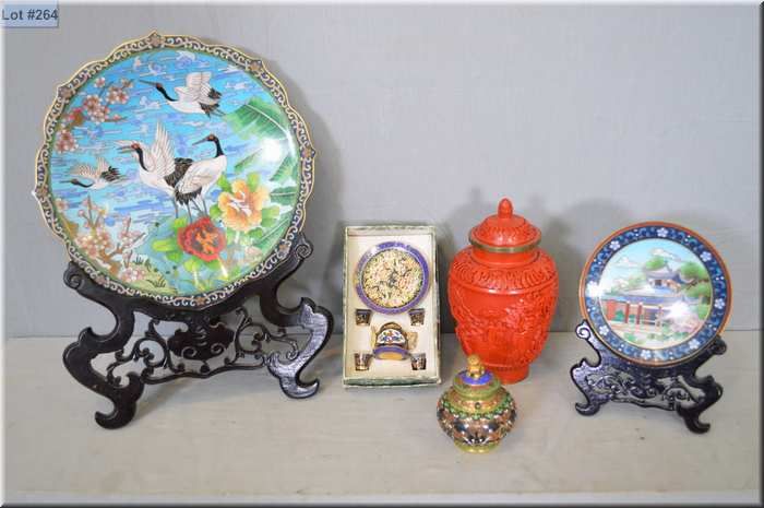 Selection of collectibles including two cloisonn‚ plates with wooden carved stands, tiny cloisonn‚ tea set, small ginger jar with foo dog finial and a cinnabar lidded ginger jar