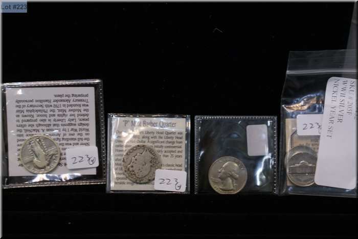 Selection of collector's coins including WWII nickels, American "P" mint Barber quarter, coloured Am