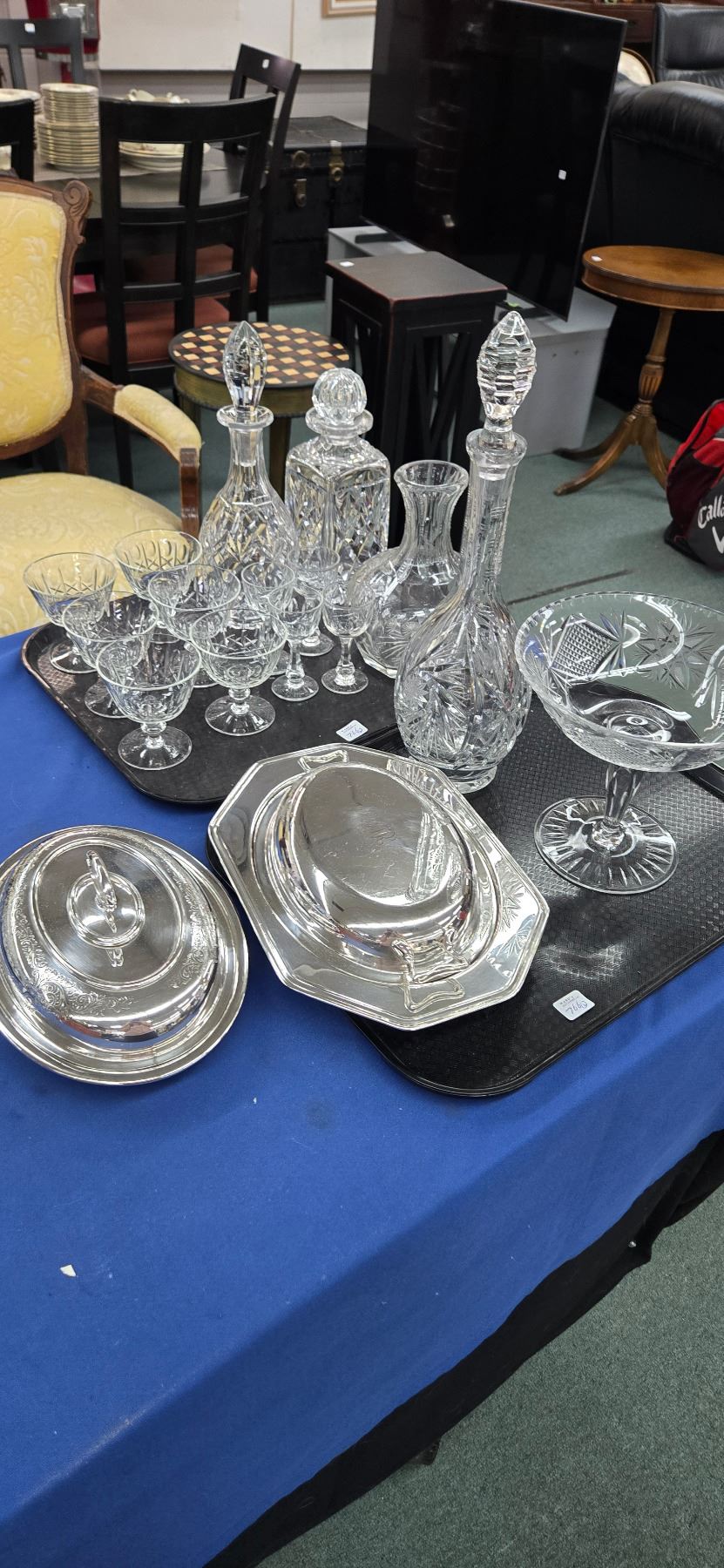 Selection of crystal including decanters, stemware, comport and two silverplate lidded serving dishes including Birks