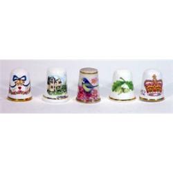 Selection of five porcelain thimbles including hand painted Royal Worcester thimble, commemorative thimbles, etc