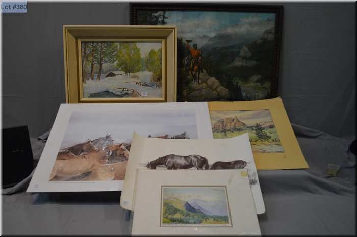 Selection of framed and unframed artworks including prints by W.J. Phillips, Isabelle Levesque etc. and a watercolour "Mount Eisenhower" signed artist D. Livingstone '56, 10" X 12"