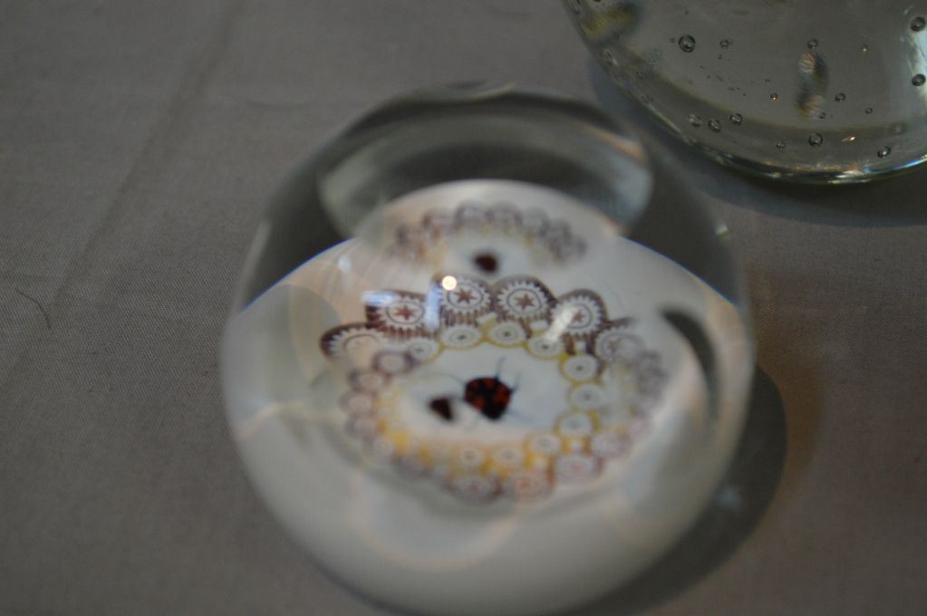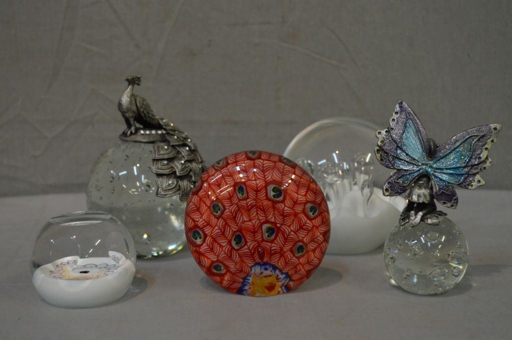 Selection of glass paperweights including clear bubble globe with pewter fairy, clear globe with pewter and crystal peacock, vintage millefiore ladybug made by Caithness, a red millefiore peacock etc.
