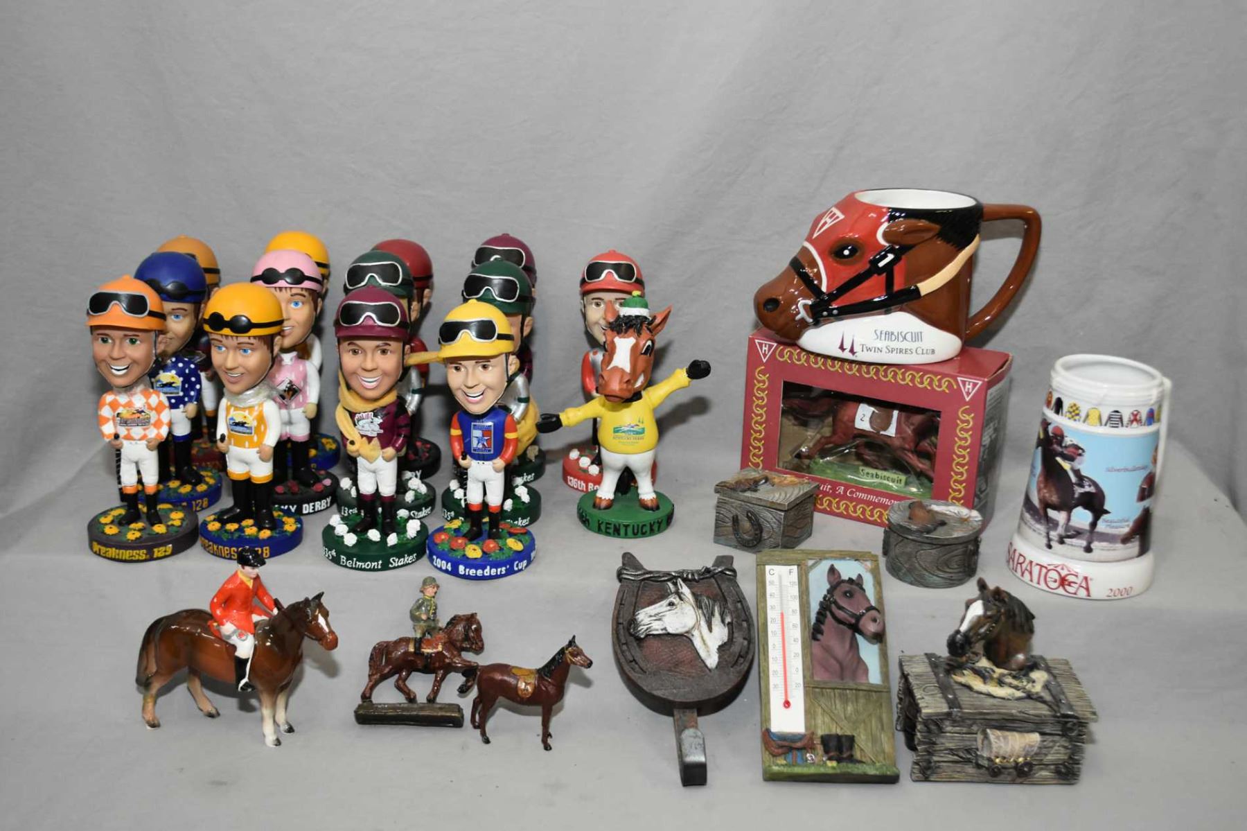Selection of horse racing collectibles including Bobble heads, mugs, trinket boxes etc.