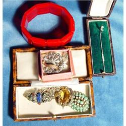 Selection of jewellery including boxed stickpin, gold coloured brooch, etc