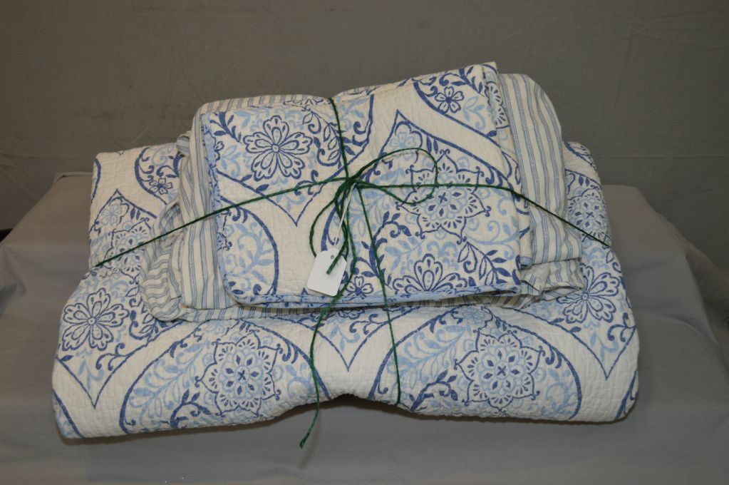 Selection of linens including bedspread, bed skirt and pillow shams
