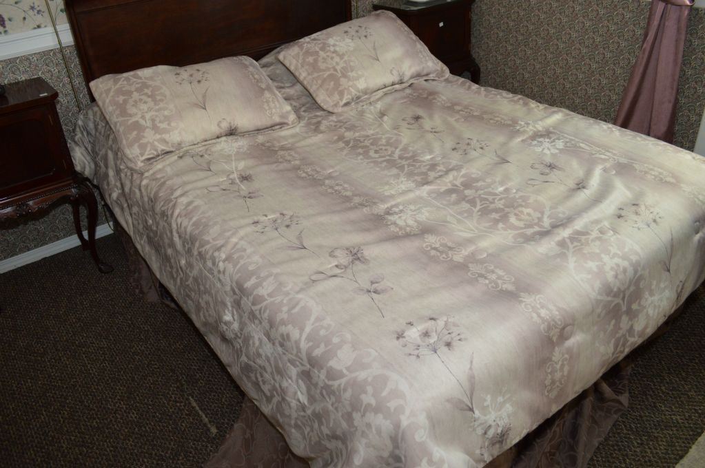 Selection of linens including bedspread, shams and curtains