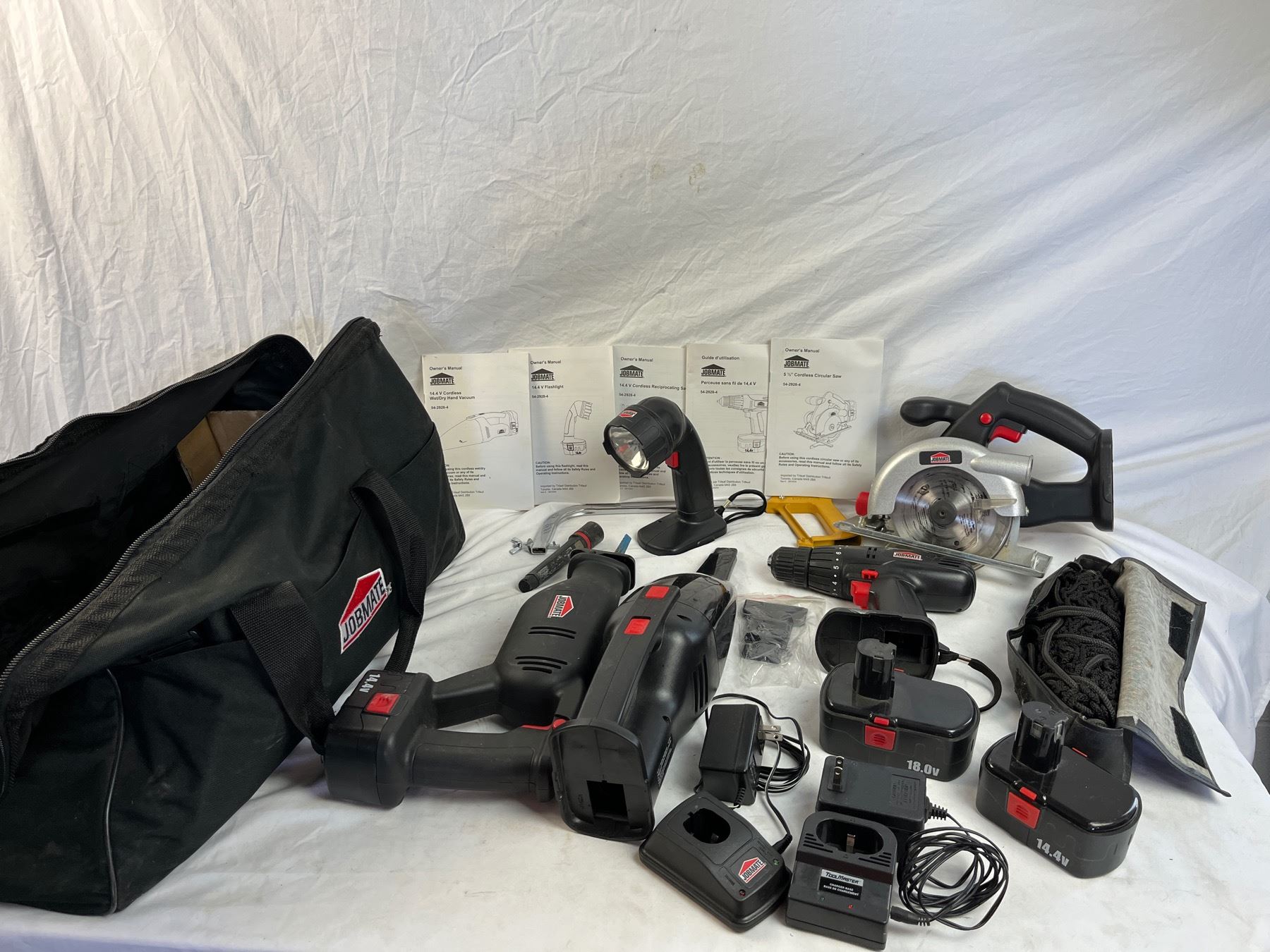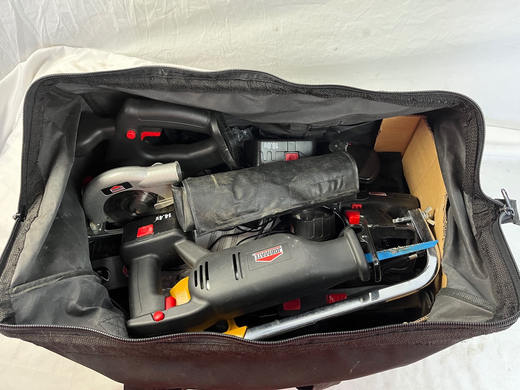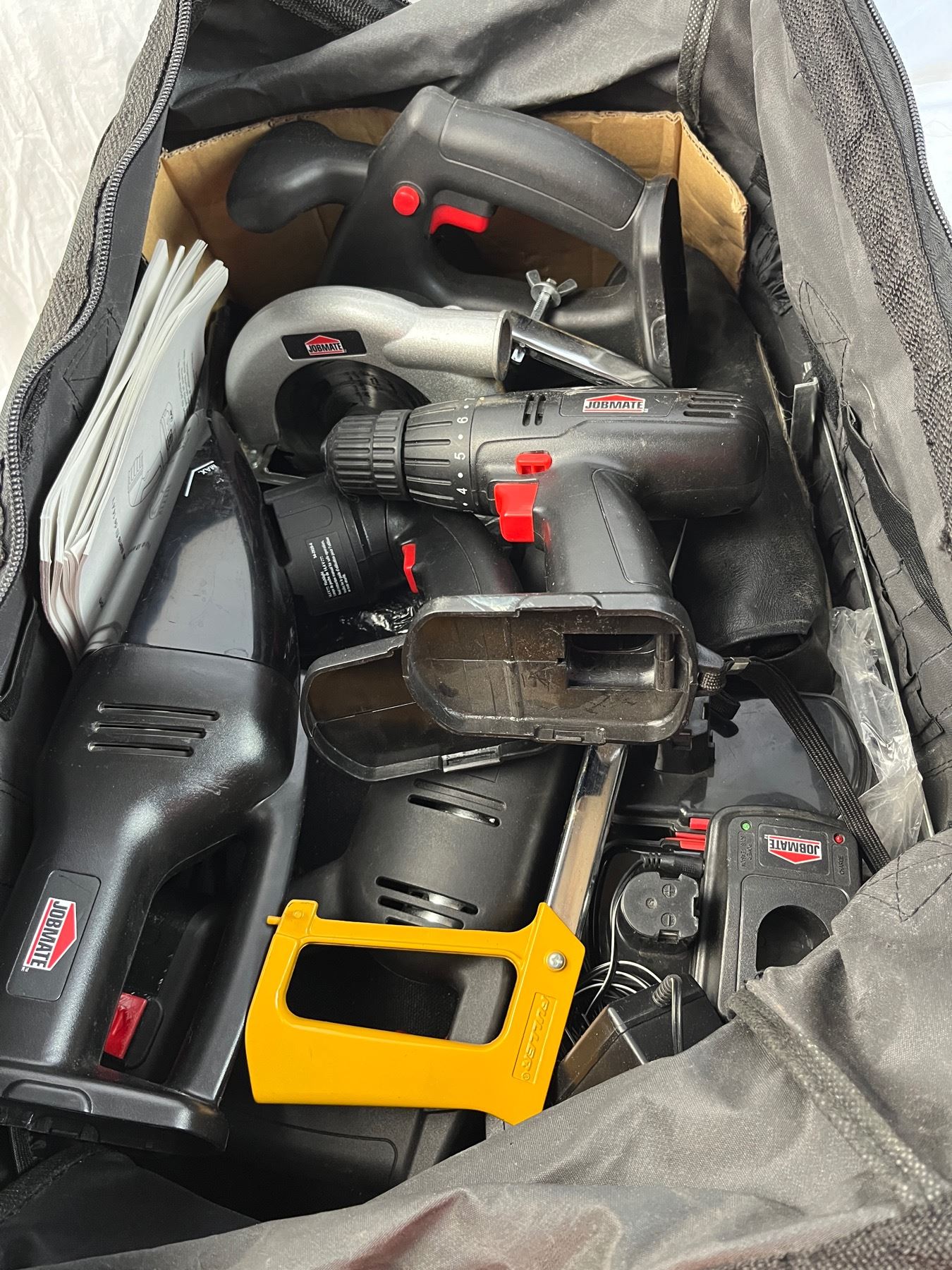 In carrying bag, includes drill, saw, flashlight, sawzall and others, missing batteries.