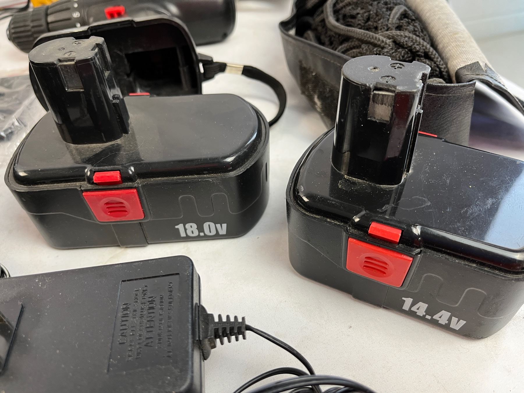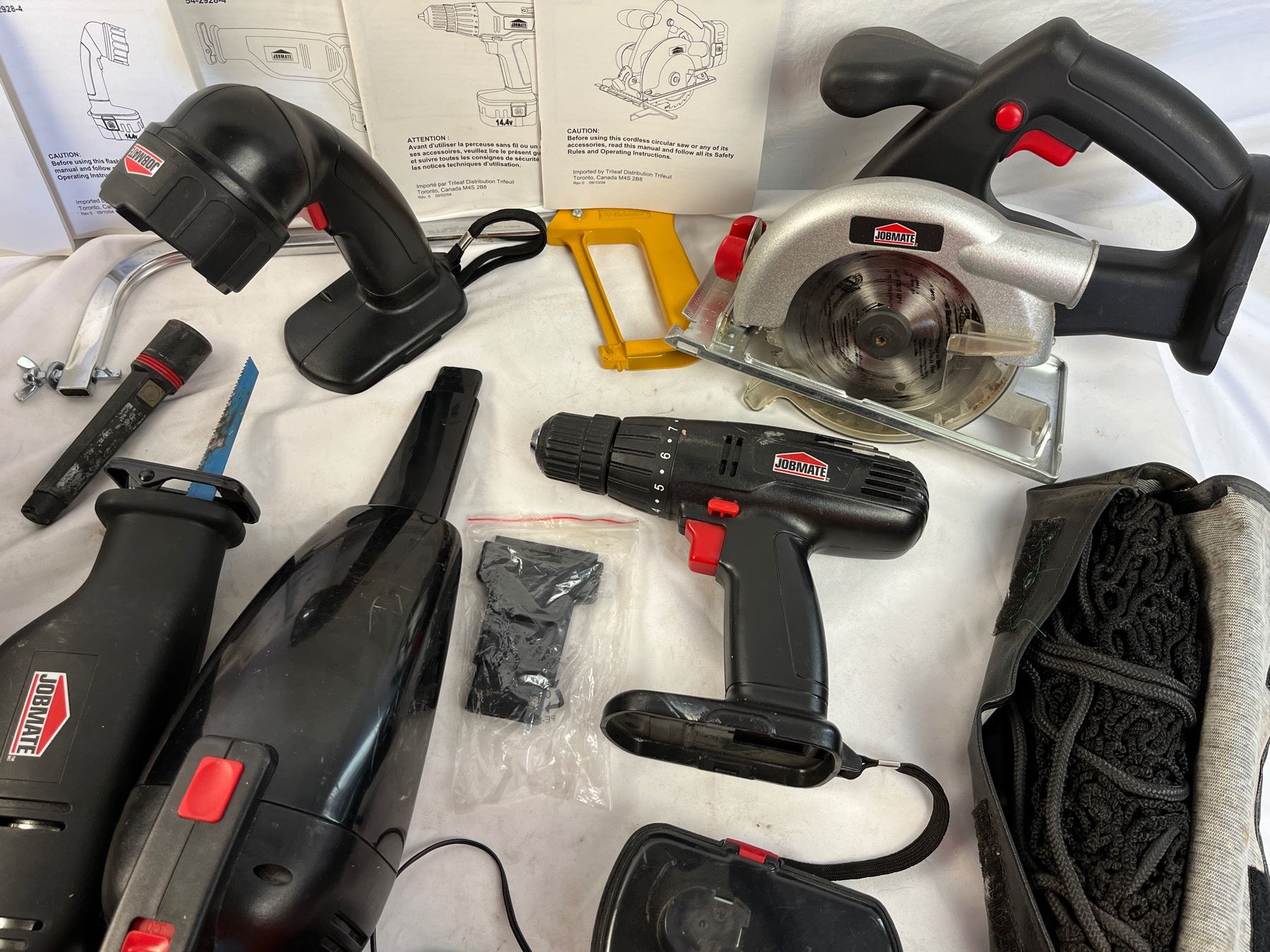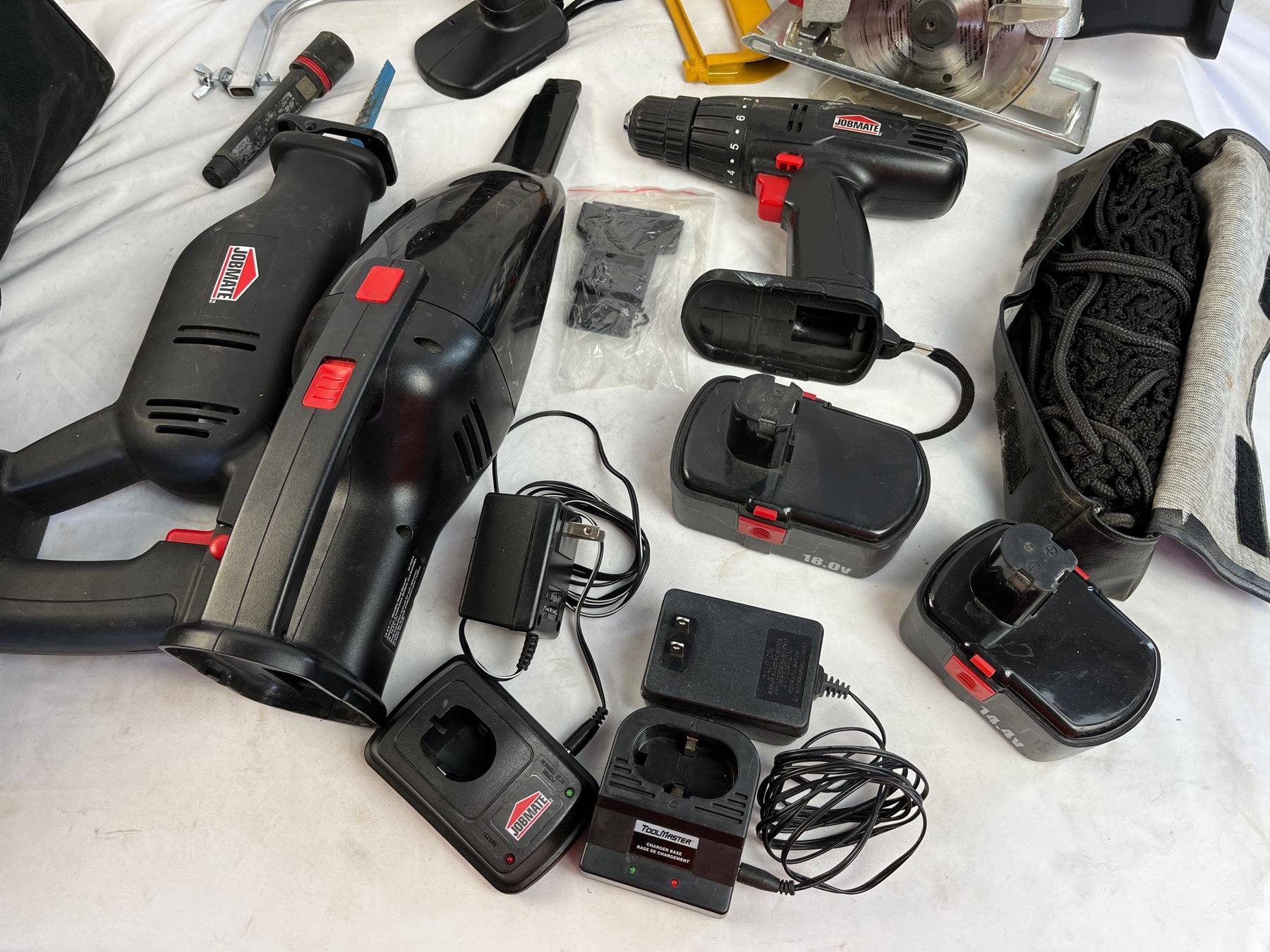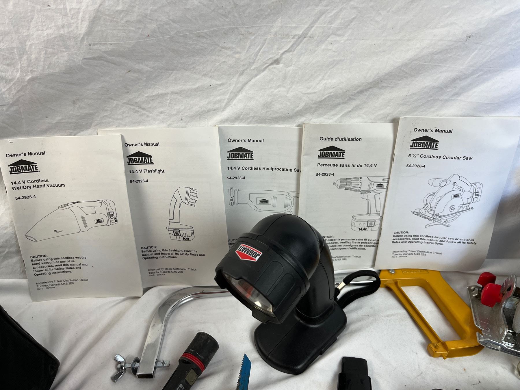 In carrying bag, includes drill, saw, flashlight, sawzall and others, missing batteries.
