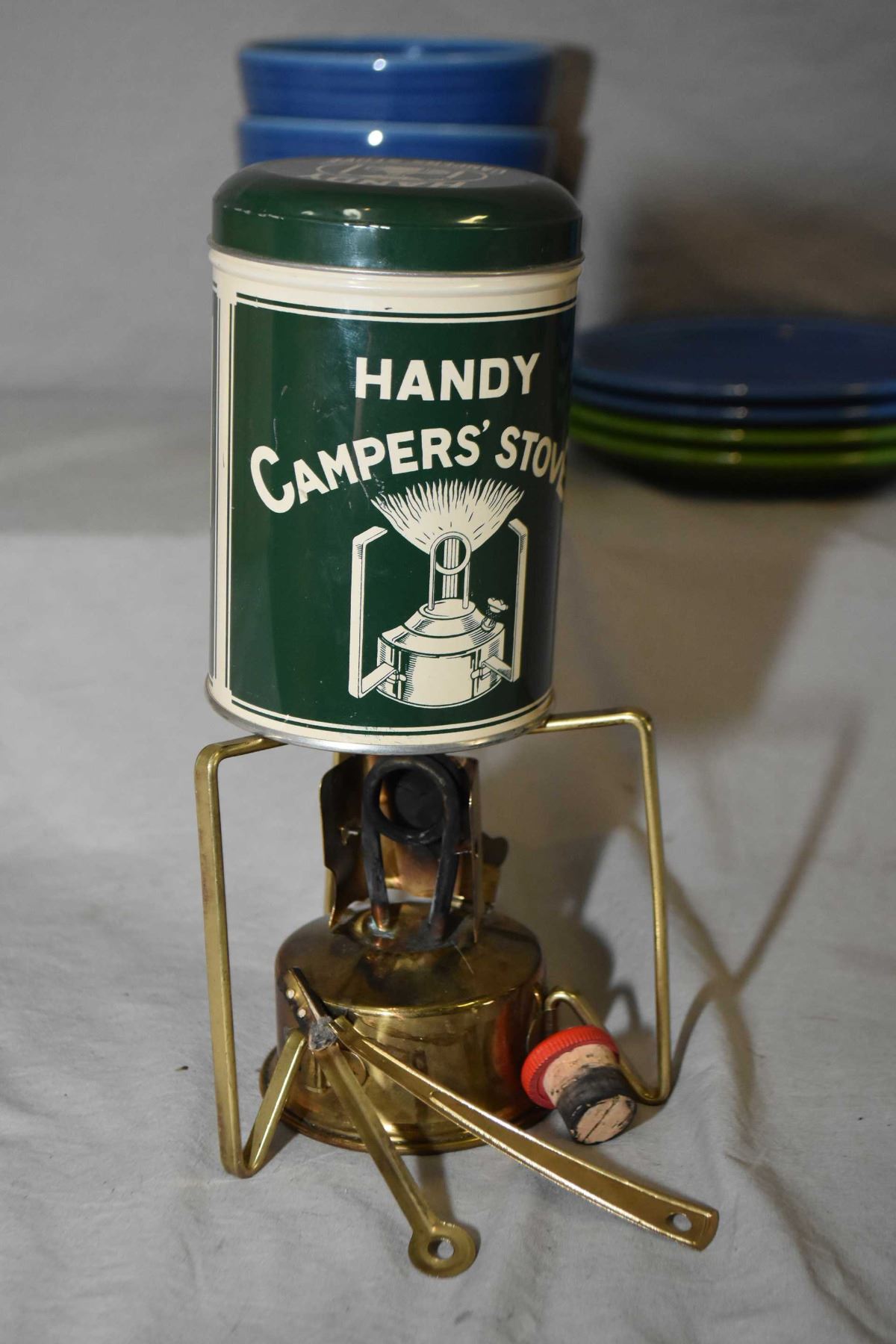 THIS ITEM NOT AVAILABLE FOR SHIPMENT. LOCAL BIDDERS ONLY. Selection of new in box Fiesta ware including two three pieces sets of blue and two three piece sets of green including dinner plates, side plate and cereal bowl plus four coffee mugs, and a small portable camp stove