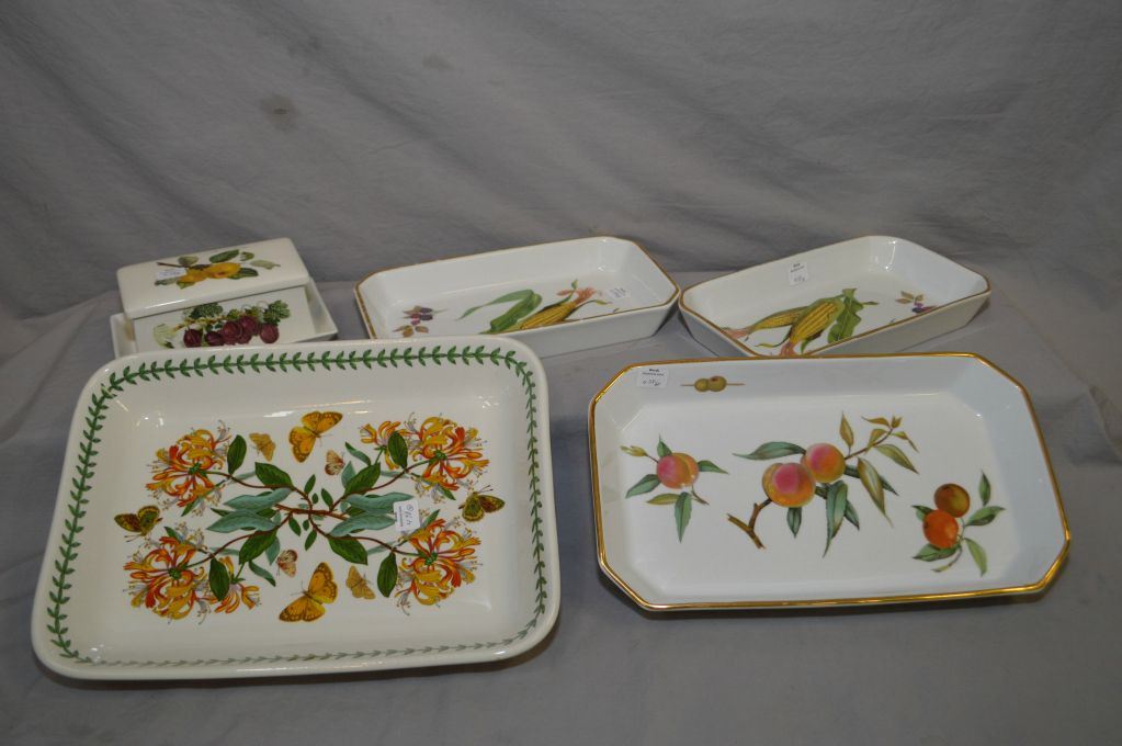 Selection of oven to tableware including three Royal Worcester casserole dishes, plus a large Portmeirion rectangular casserole and "Pomona" covered butter dish