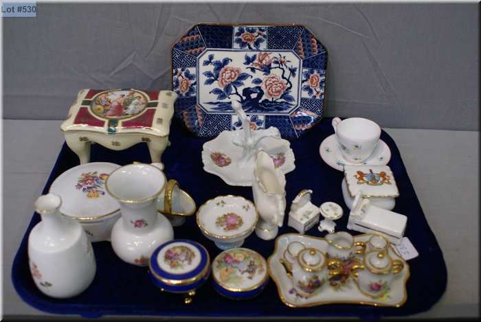Selection of porcelain miniatures including Limoges lidded trinket boxes, small tea set, Royal Crown Derby etc.