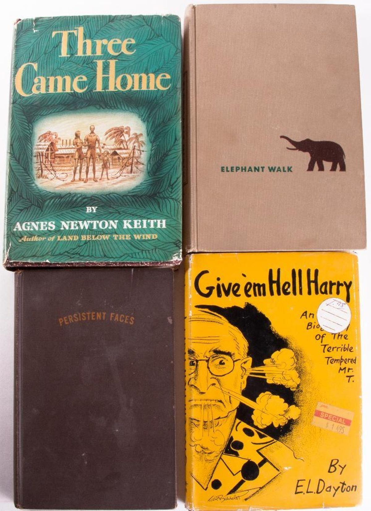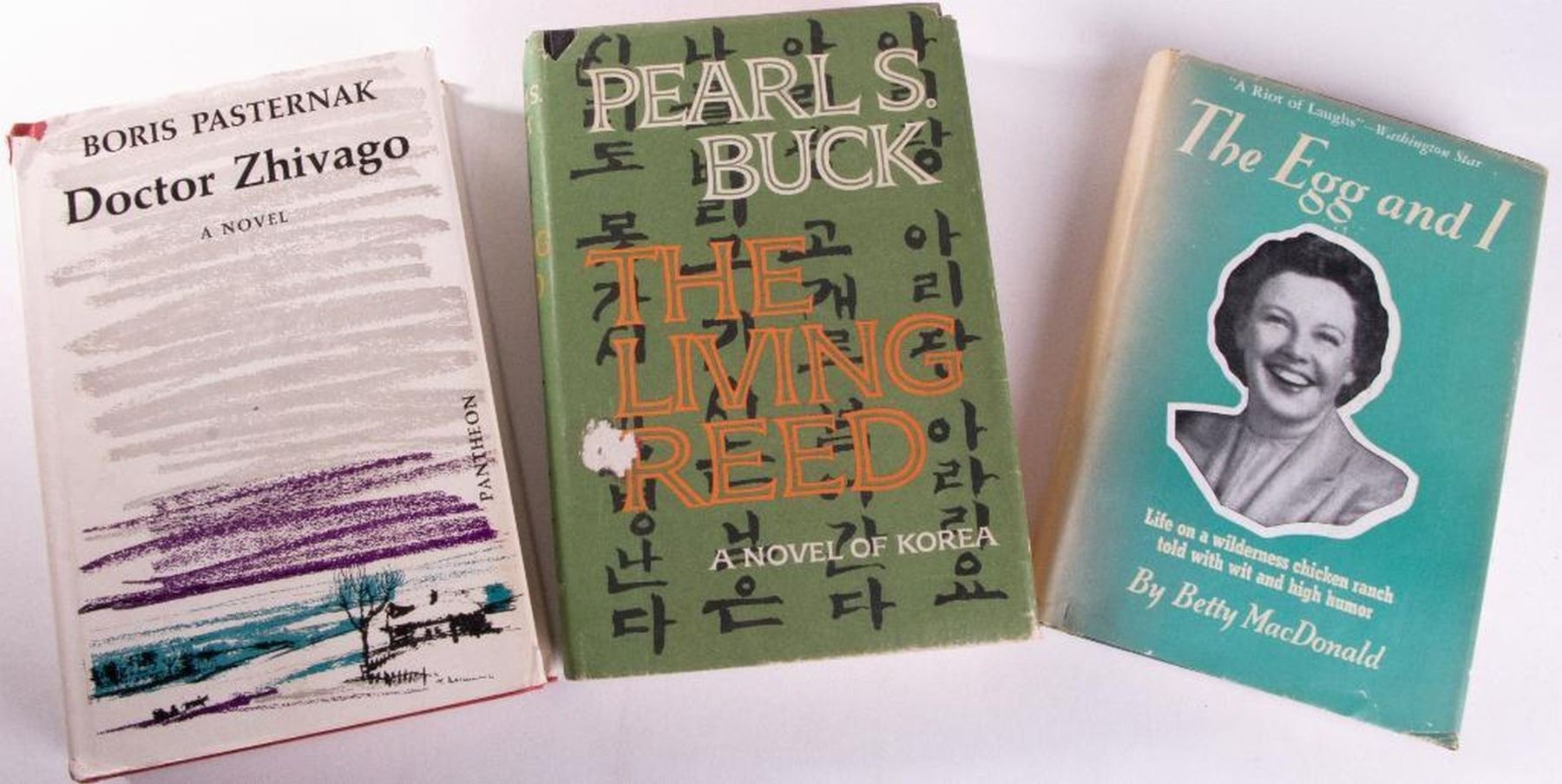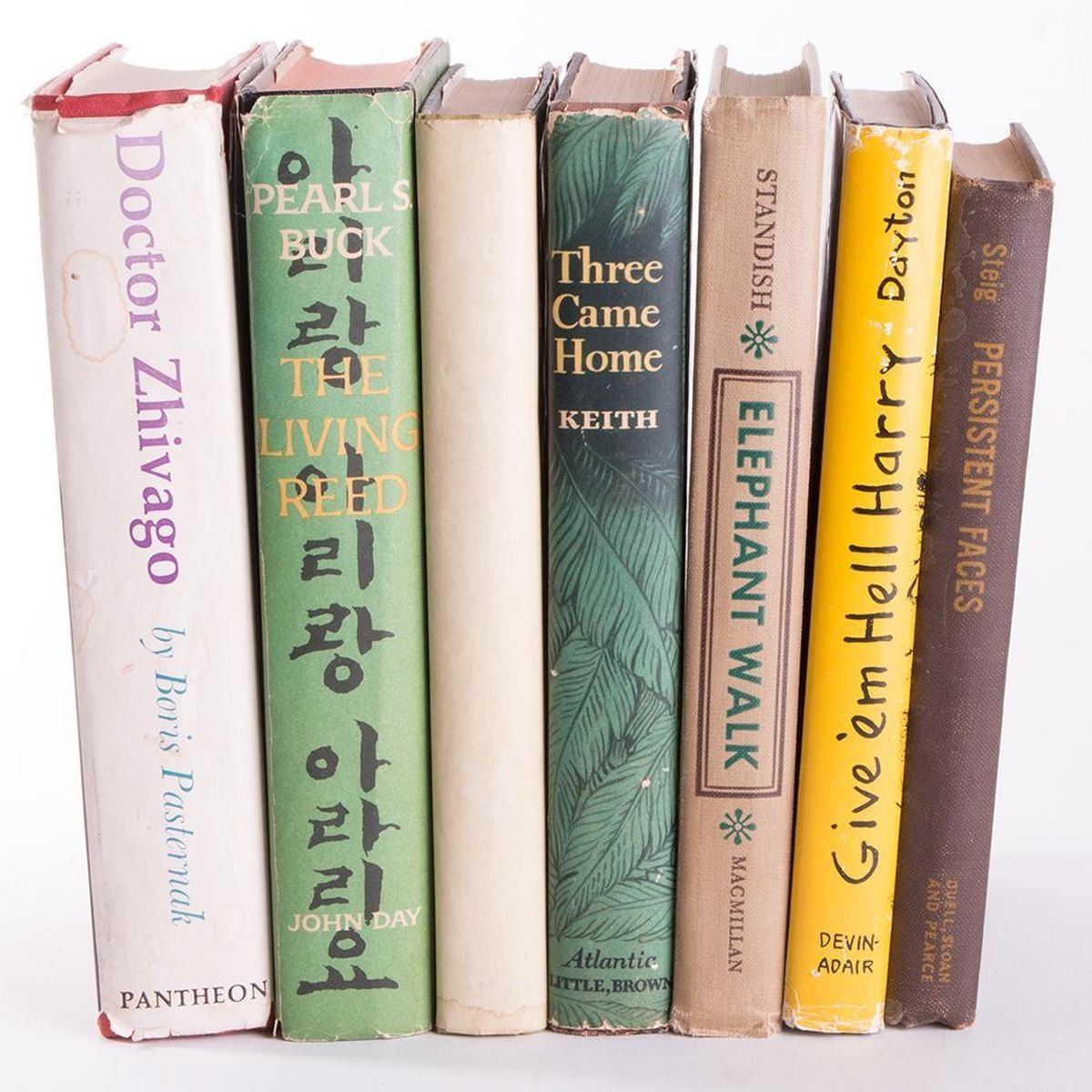 Titles: Doctor Zhivago (1958 Pantheon Edition), The Living Reed, Elephant Walk, Three Came Home, The Egg and I, Give €™em Hell Harry: An Informal Biography of the Terrible Tempered Mr. T, Persistent Faces Authors: Boris Pasternak, Pearls Buck, Robert Standish, Agnes Newton Keith, Betty MacDonald, E.L. Dayton, William Steig Place: Various places Publisher: Various publishers Date: Various dates Description: An array of classics mixed with humour to lighten the mood. Condition: Good