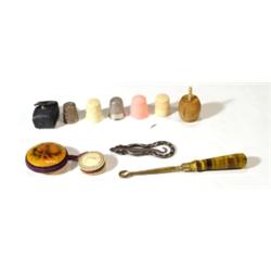 Selection of sewing items including turned wooden tape measure, stained ivory emery board, continental silver thimble, pin cushion etc