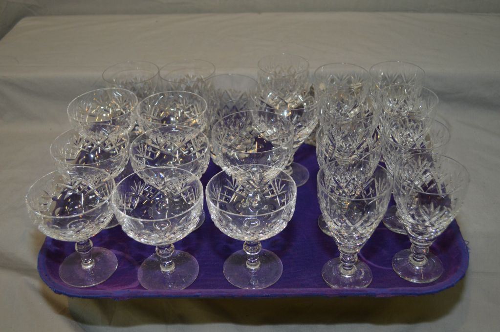 THIS ITEM IS NOT AVAILABLE FOR SHIPMENT. LOCAL BIDDERS ONLY. Selection of signed Webb and Corbett crystal stemware "Georgian" including seven champagne, nine juice, two large juice and two small tumblers plus a set of crystal shakers