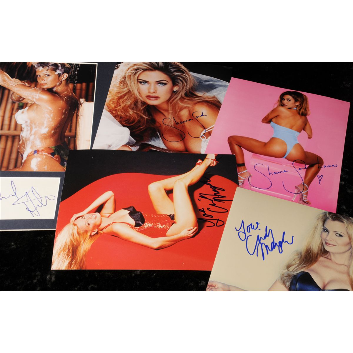 Including two signed photographs of Shauna Sand, two signed colour photographs of Cindy Margolis and mounted autograph of Rachel Hunter with nude photograph together with a print of Marilyn Monroe nude posing for Playboy (6)