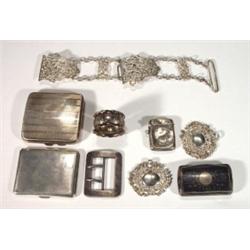 Selection of silver and silver plated items including cigarette cases, buckles, vesta etc