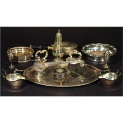 Selection of silver plated items including two wine coaster, pepperpot, sugar sifters, twin handled tray, etc
