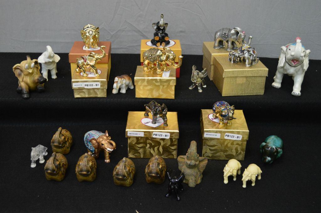 Selection of small elephant collectibles including enamelled with boxes and embellished with Swarvoski crystals, pottery elephants, cast, glass etc.