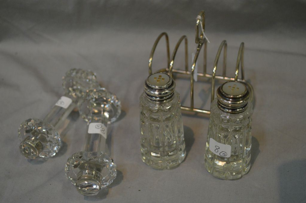Selection of sterling silver including British hallmarked toast rack, two crystal knife rests with sterling collars, and a pair of crystal shakers with sterling tops