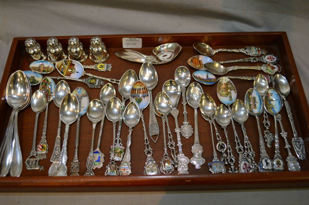 Selection of sterling silver including enamelled collector's spoons, two sets of shakers, Tiffany and Co. sterling spoon rest etc.
