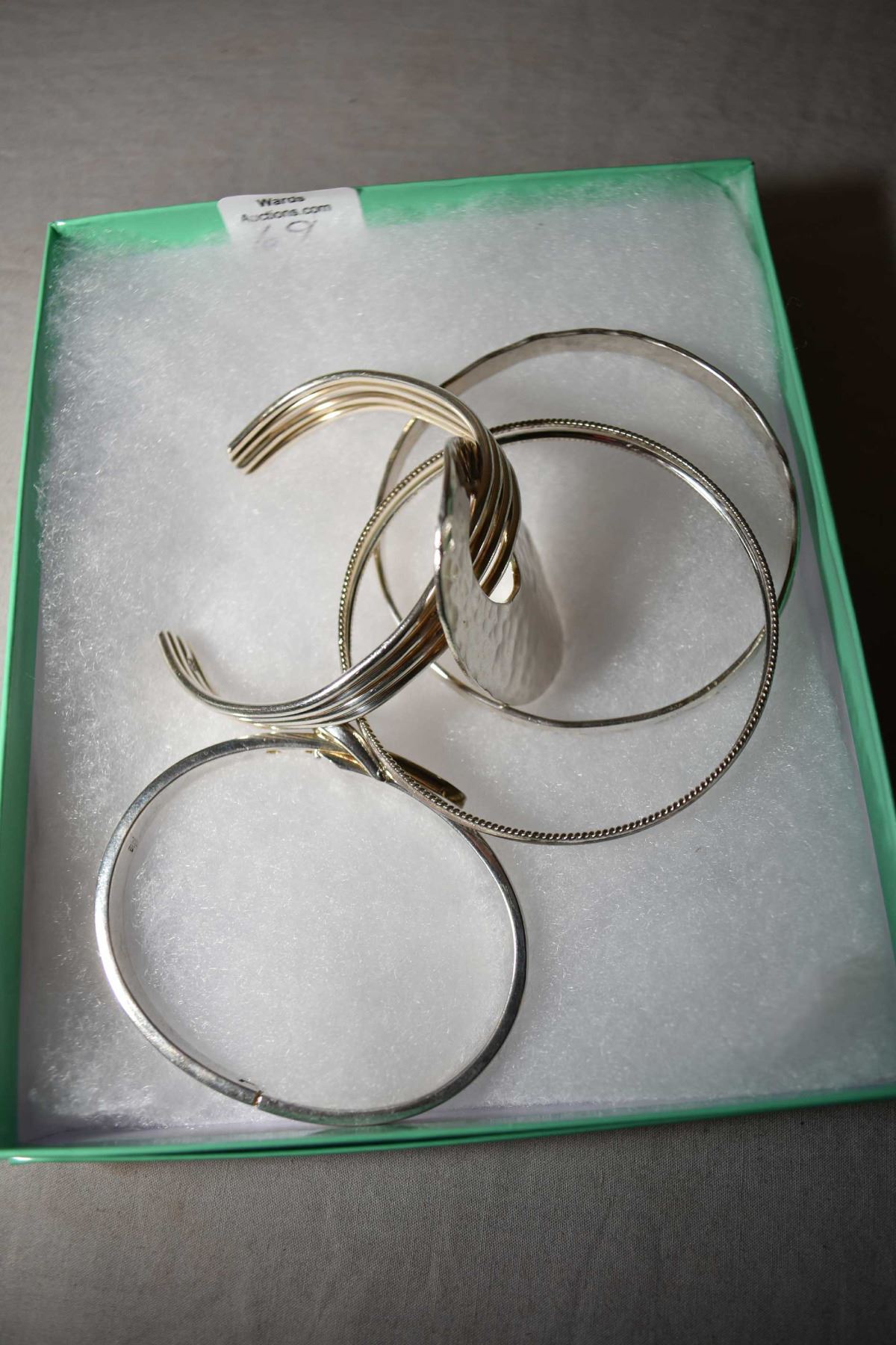 Selection of sterling silver jewellery including two bangles, a hinged buckle braclet and a hand hammered bracelet