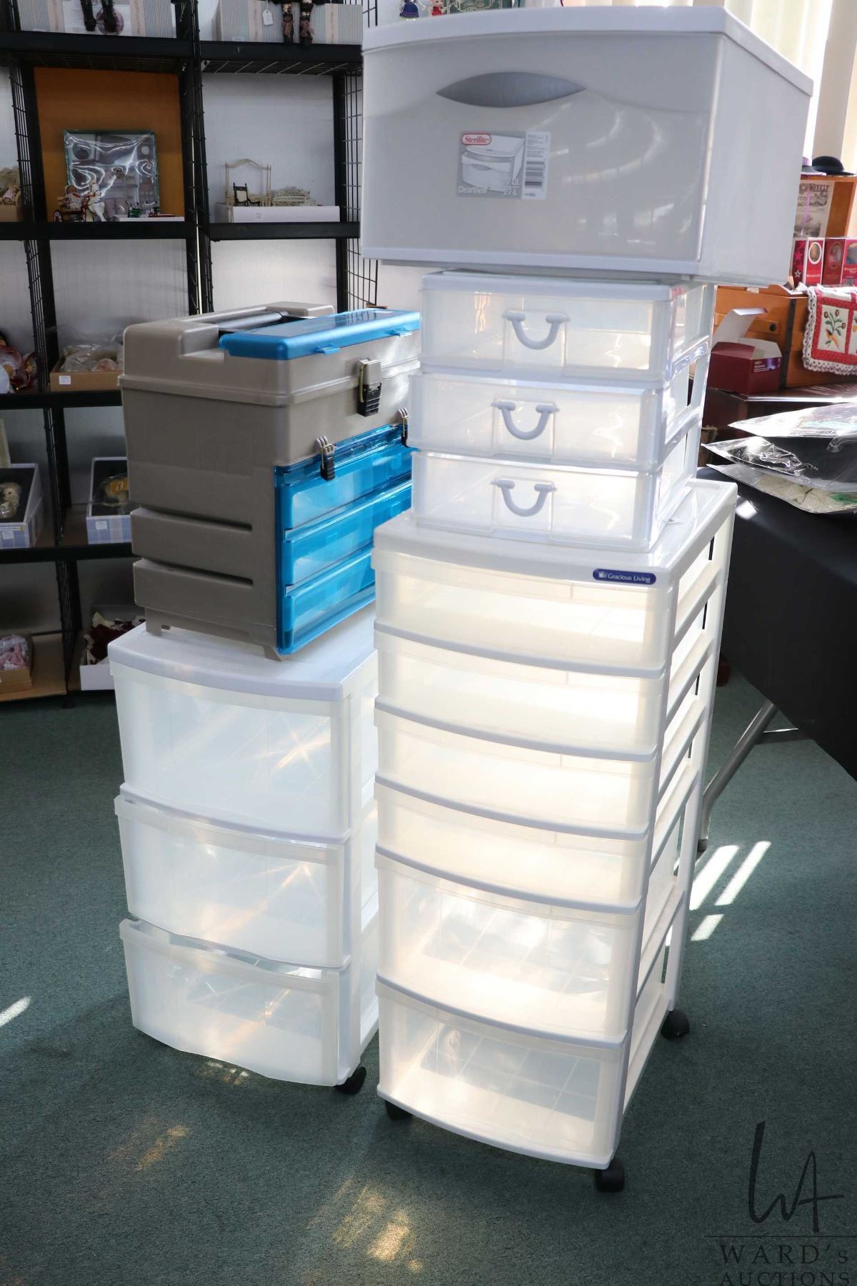 Selection of storage bins including two rolling, two small stationary and a carry case