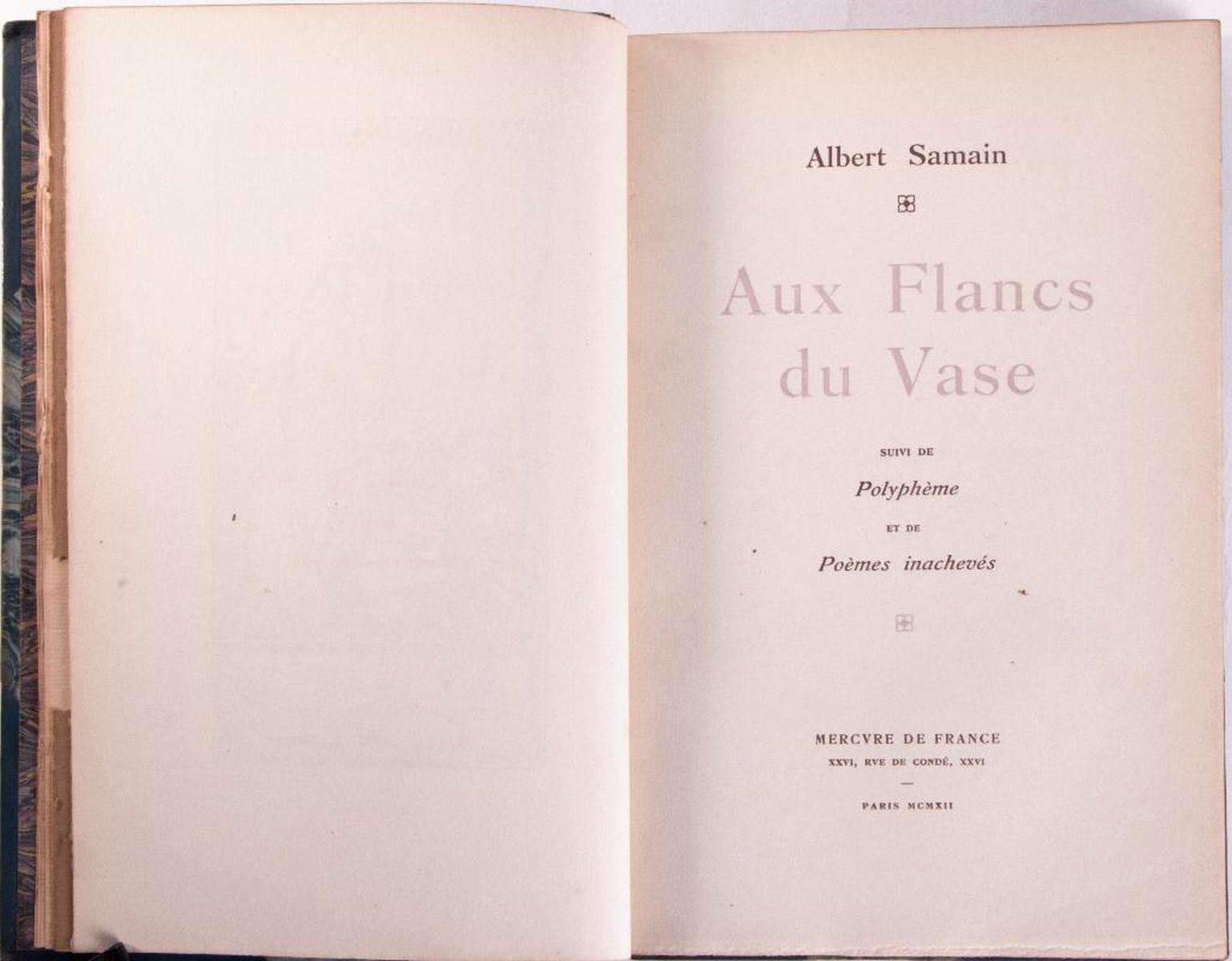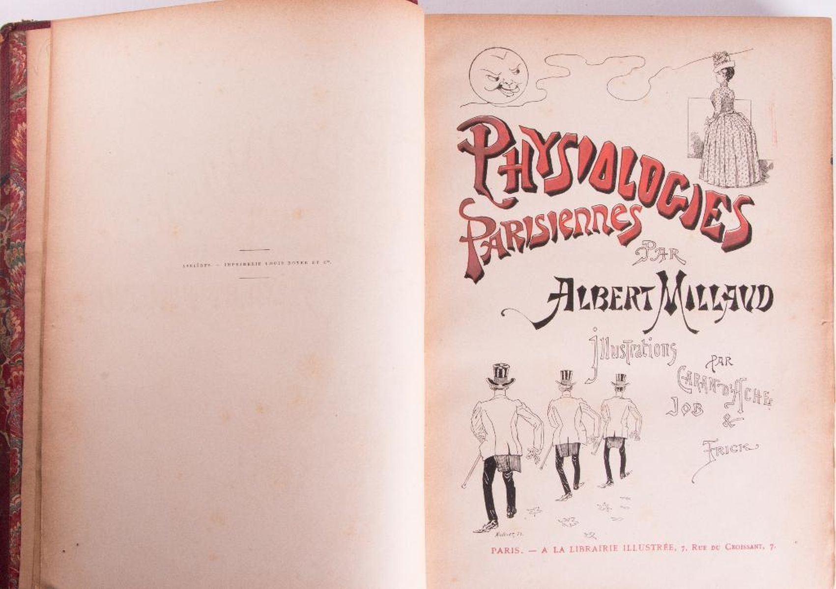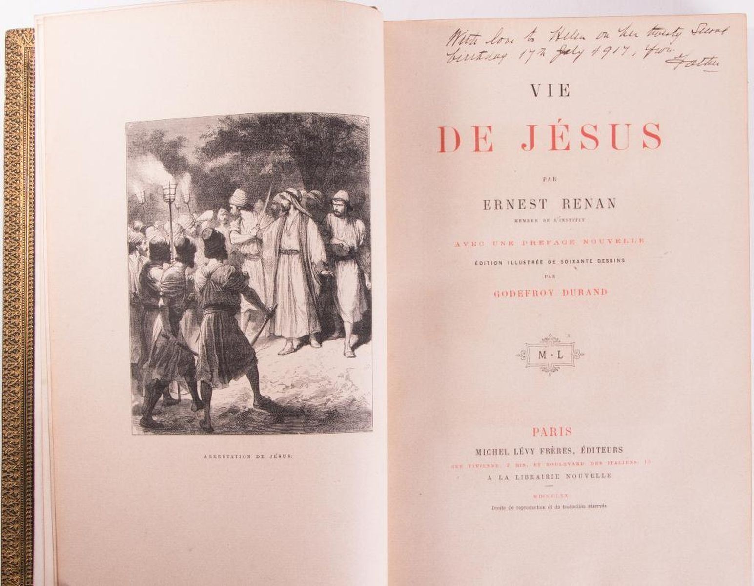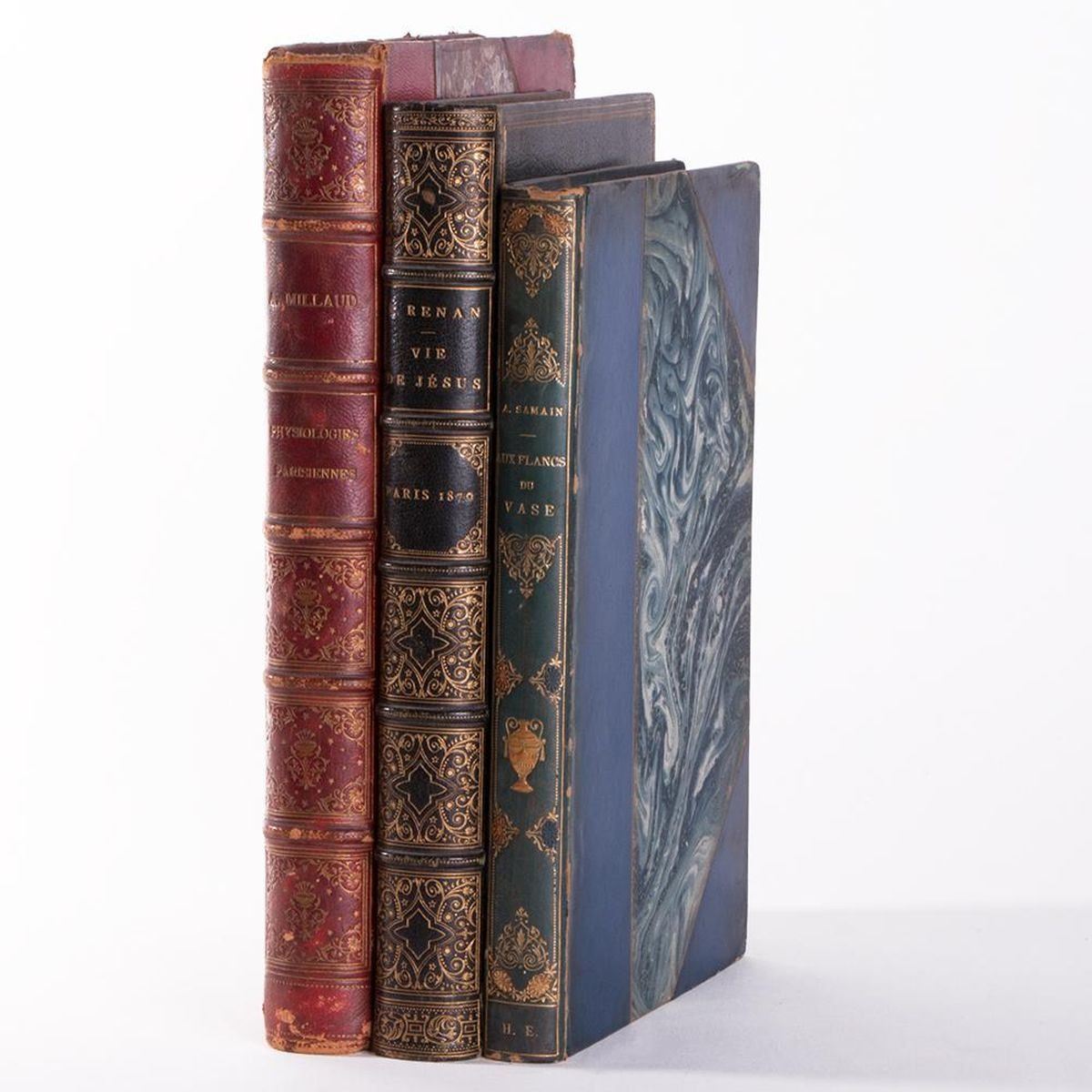 Description: Selection of three works in French Includes: Title: Vie de Jesus by Ernest Renan. Published in 1870 by Michel Levy Freres, Paris. 60 illustrations by Godefroy Durand. Blue Morocco leather and marbled boards. Five raised spine bands with gilt accents and letters. Title: Physiologies Parisiennes by Albert Millaud. Published in 1887 by La Librairie Illustree, Paris. Bound in red leather and marbled boards. Five raised spine bands with gilt accents and letters. Title: Aux Flancs du Vase Suivi de Polypheme et de Poemes Inacheves by Albert Samain. Published in 1912 by Mercvre de France, Paris. Bound in blue leather and marbled boards. Gilt letters and design. Condition: Overall, very good condition. Light sunning to spines.