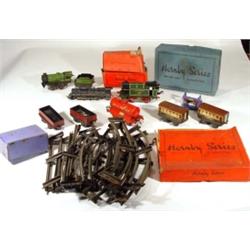 Selection of tin plate Hornby railway equipment including locomotives, Pullman cars, boxed railway, buffers etc