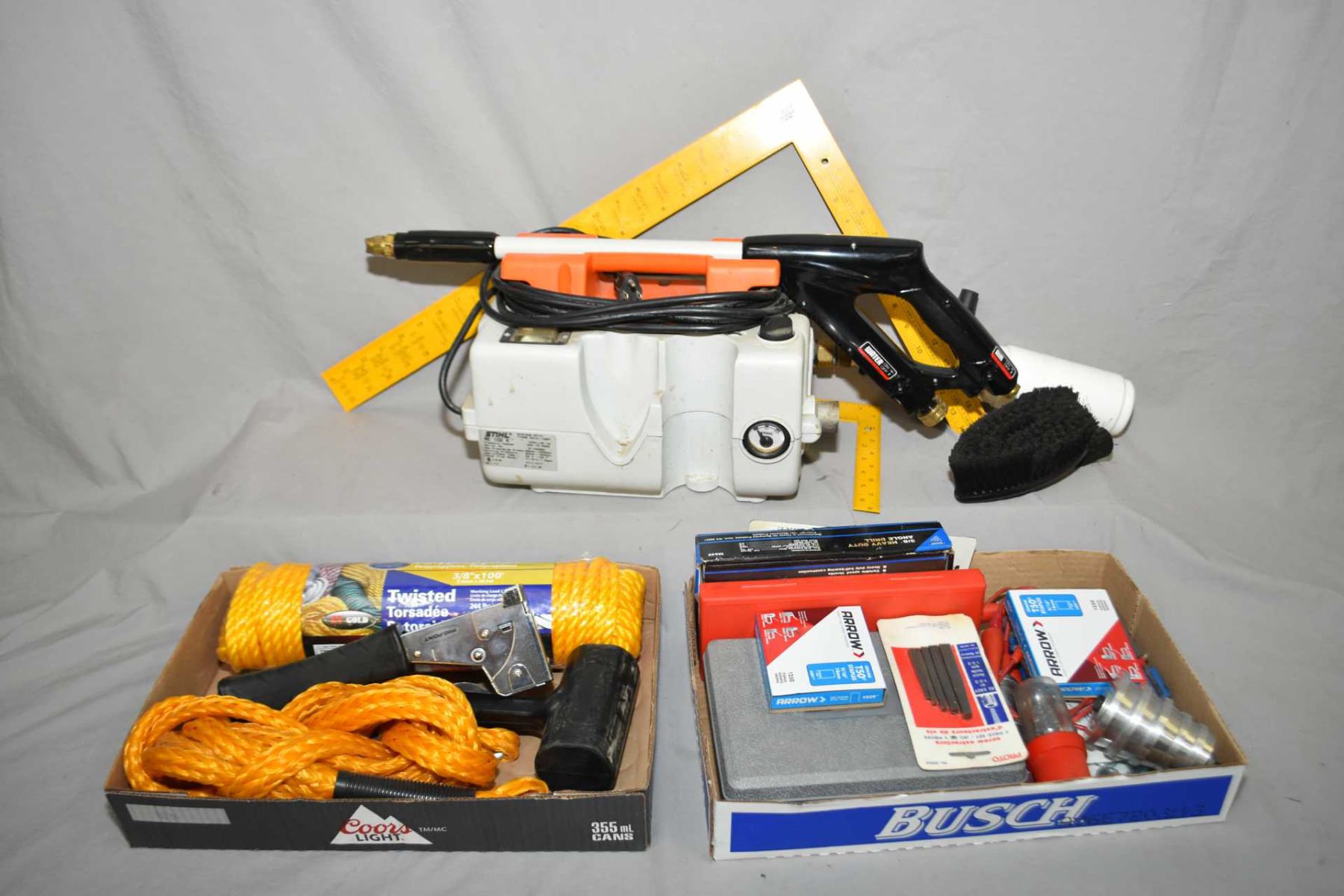 Selection of tools including air die grinder, angle drill, callipers, staplers, squares, bearing and seal drivers, pressure washer sans hose etc.