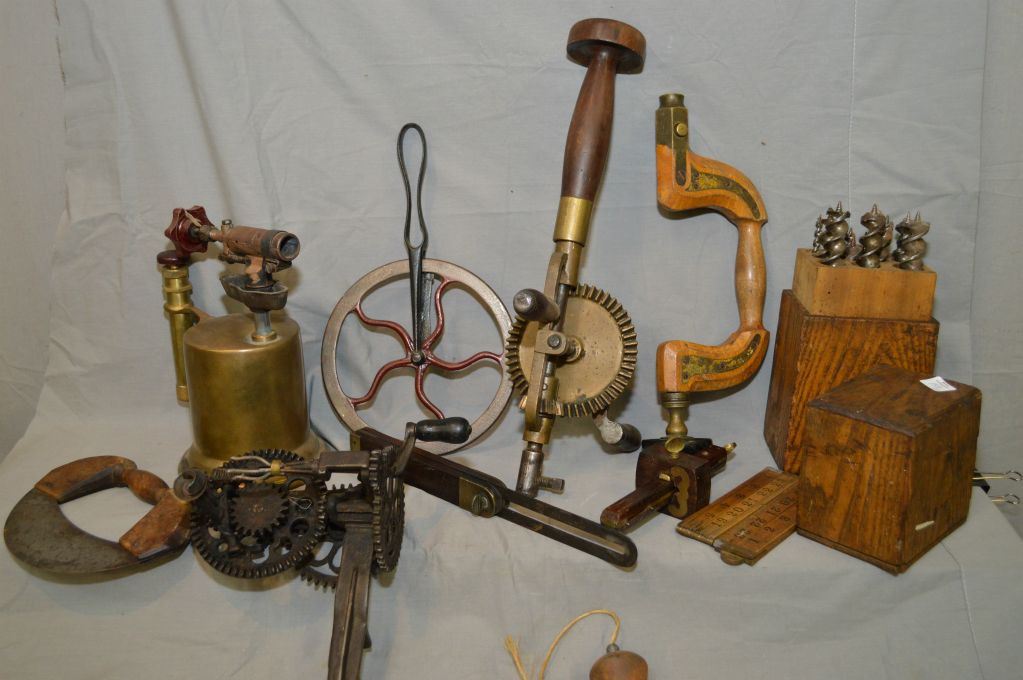 Selection of tools including blow torch, peeler, braces, fitted box of bits etc.