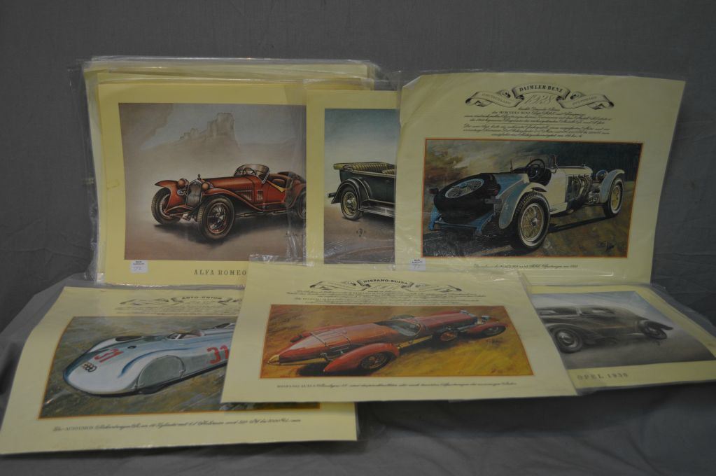 Selection of unframed vintage car prints including Mercedes Benz, Plymouth, Auto-Union etc.