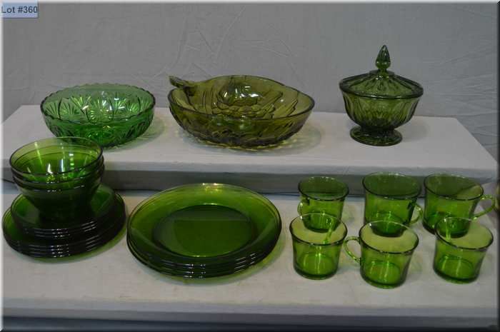 Selection of vintage bottle green glassware including embossed and lidded candy dish, grape motif bowl and six cups, side plates, bowls etc.