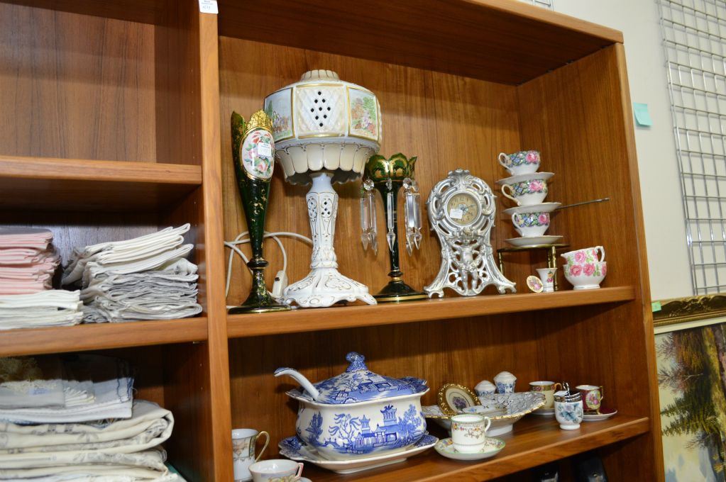 THIS ITEM IS NOT AVAILABLE FOR SHIPMENT. LOCAL BIDDERS ONLY. Selection of vintage collectibles including Burleighware lidded tureen with ladle and under plate, figural clock, antique glass girandole and matching vase, Dresden style lamp, tea cups and saucers including hand painted Nippon, Minton, Worcester egg coddler etc.