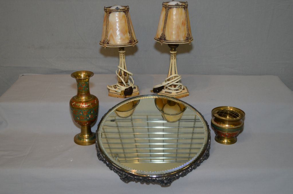 Selection of vintage collectibles including metal stand with bevelled mirror top, two pairs of painted metal bedside lamps and two brass vases