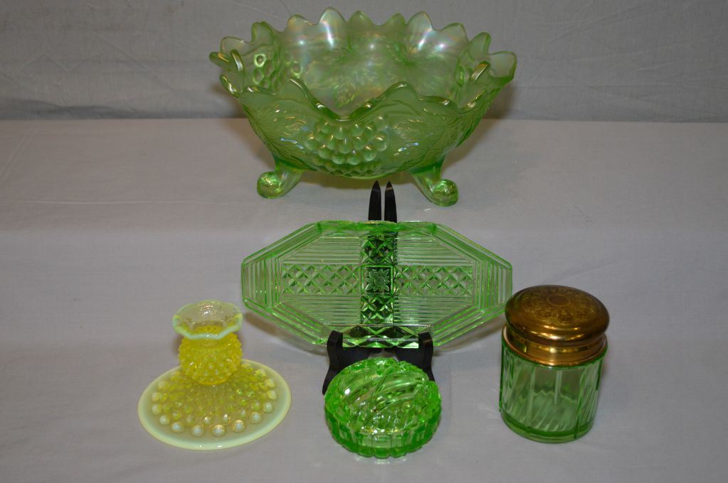 Selection of vintage pressed glass including fluted bowl decorated with fruit and foliage, and uranium glass including pin tray, lidded jar, dresser jar and hobnail candlestick