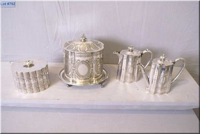 Selection of vintage silve rplate including small tea pot with matching hot water pot, a heavily chaised footed biscuit barrel and a tea caddy"