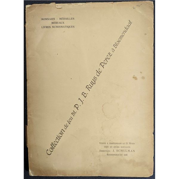Schulman, Jacques. CATALOGUE DE LA COLLECTION RENOMMEE ET IMPORTANTE DE MONNAIES ET MEDAILLES DE FEU M. P. J. B. RUYS DE PEREZ A BLOEMENDAAL. March 21