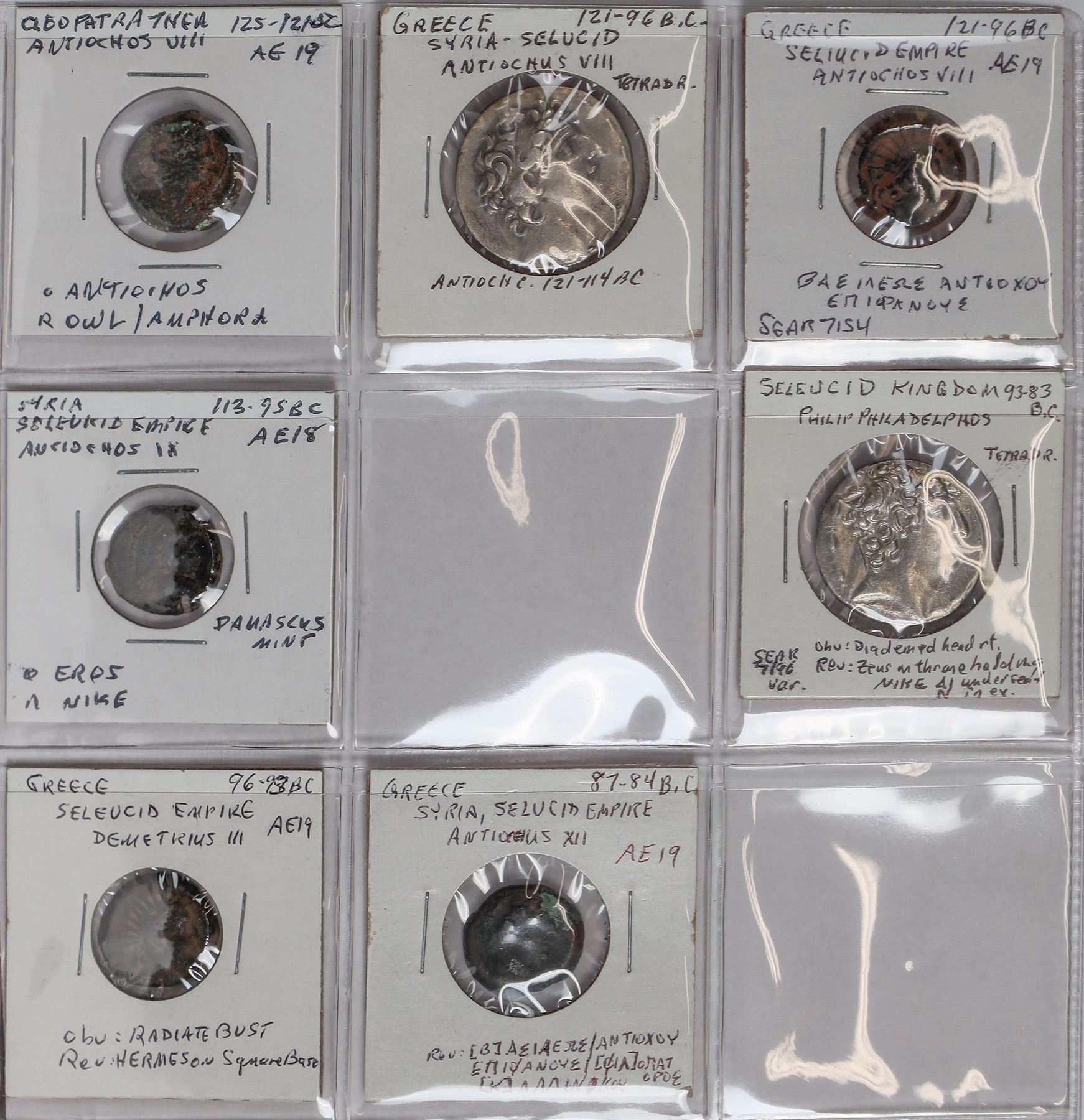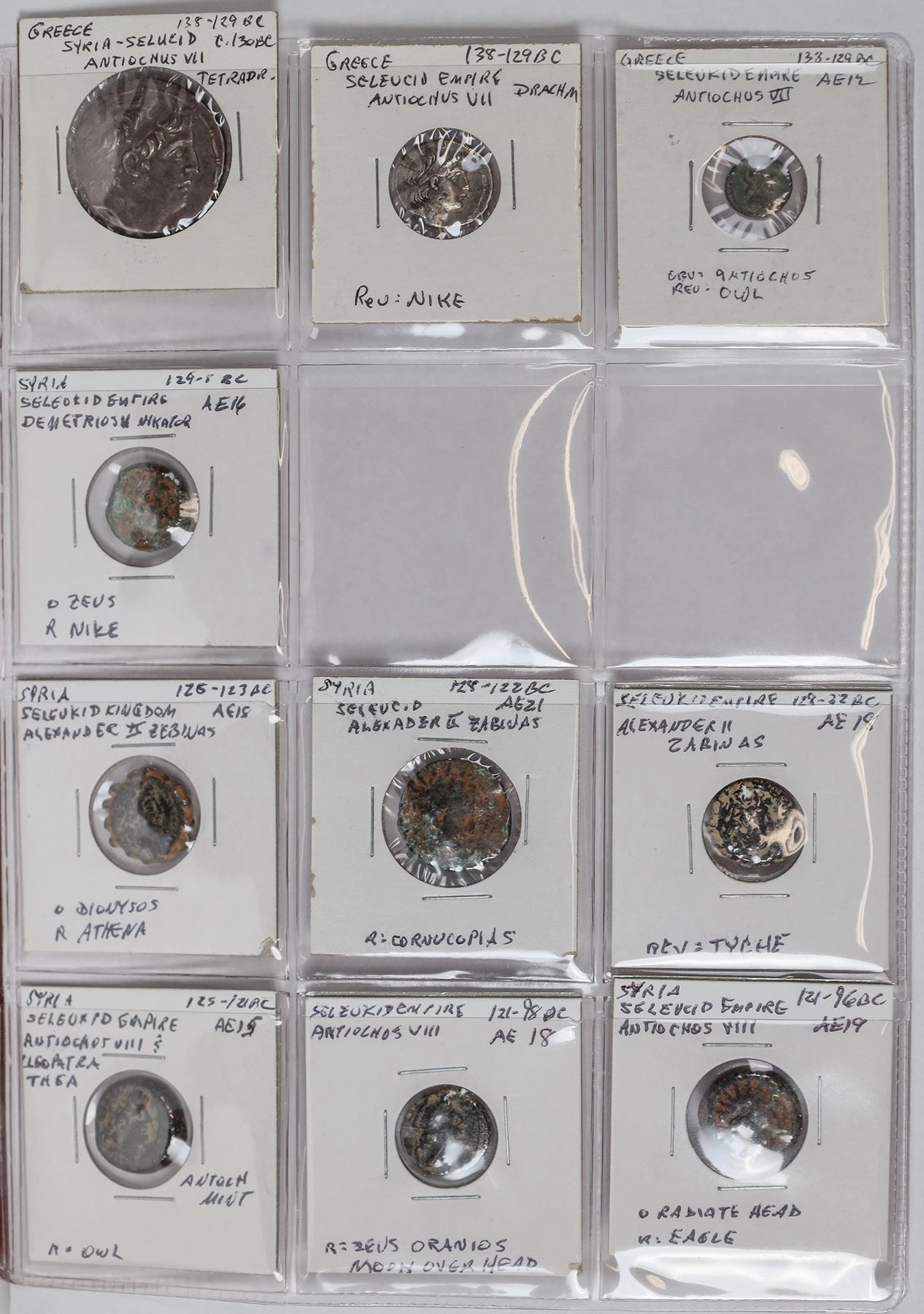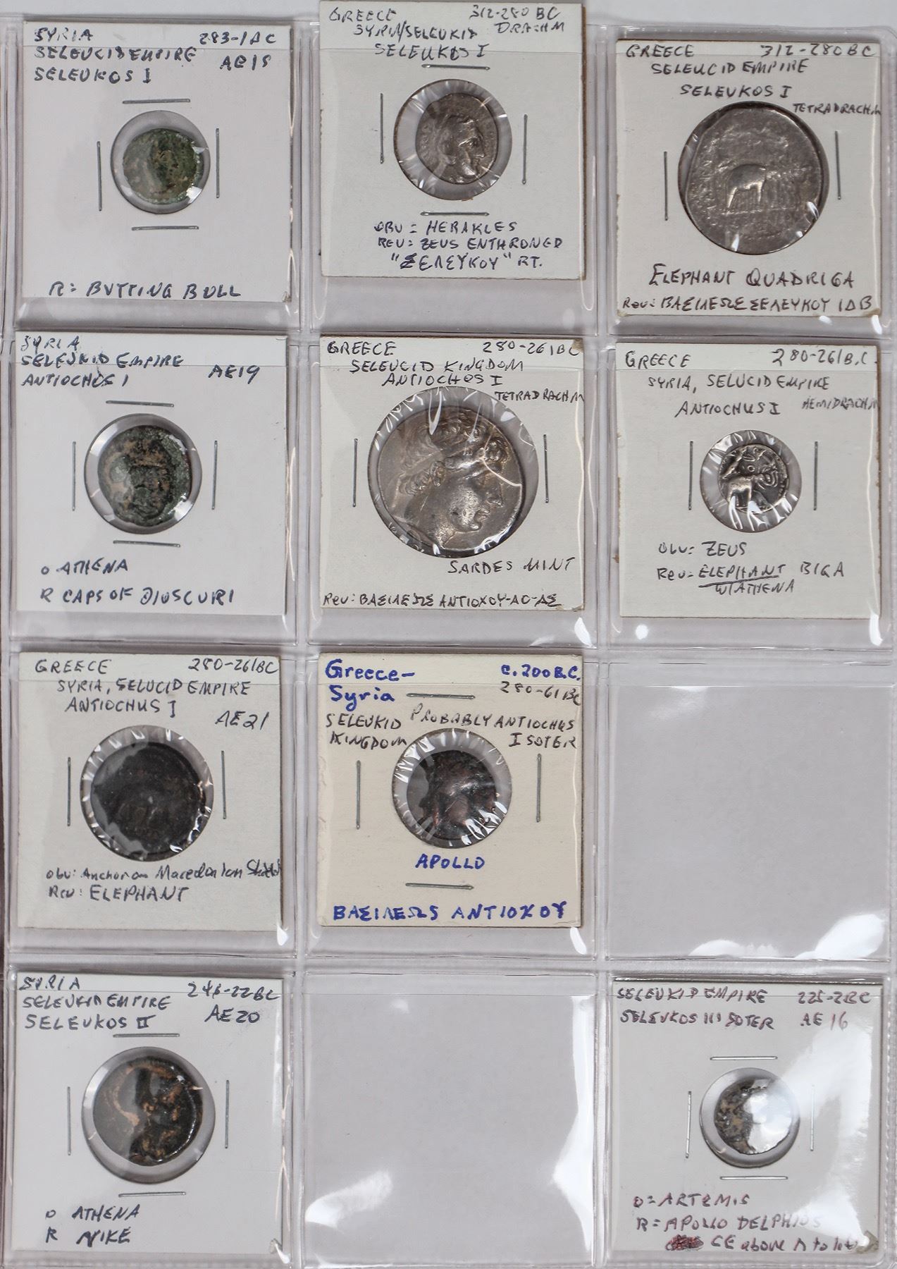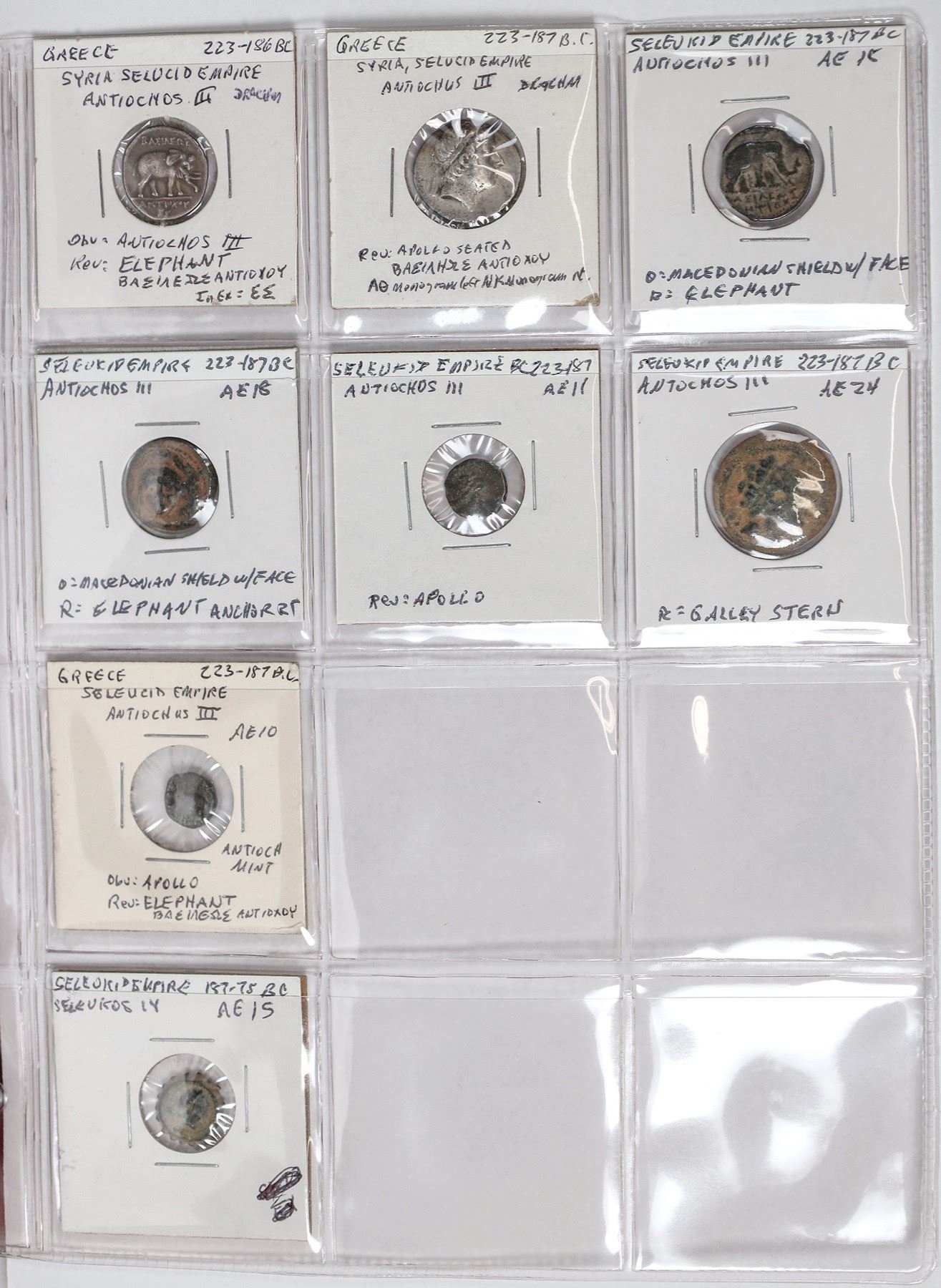 Dansco album #7000 with slipcover with 49 Seleucid coins: 37 bronze and 12 silver coins with 5 tetradrachms. All identified, fine or better including Seleukos II, tetradrachm with elephant. Antochos I, III, IV and Philip Philadelphos.