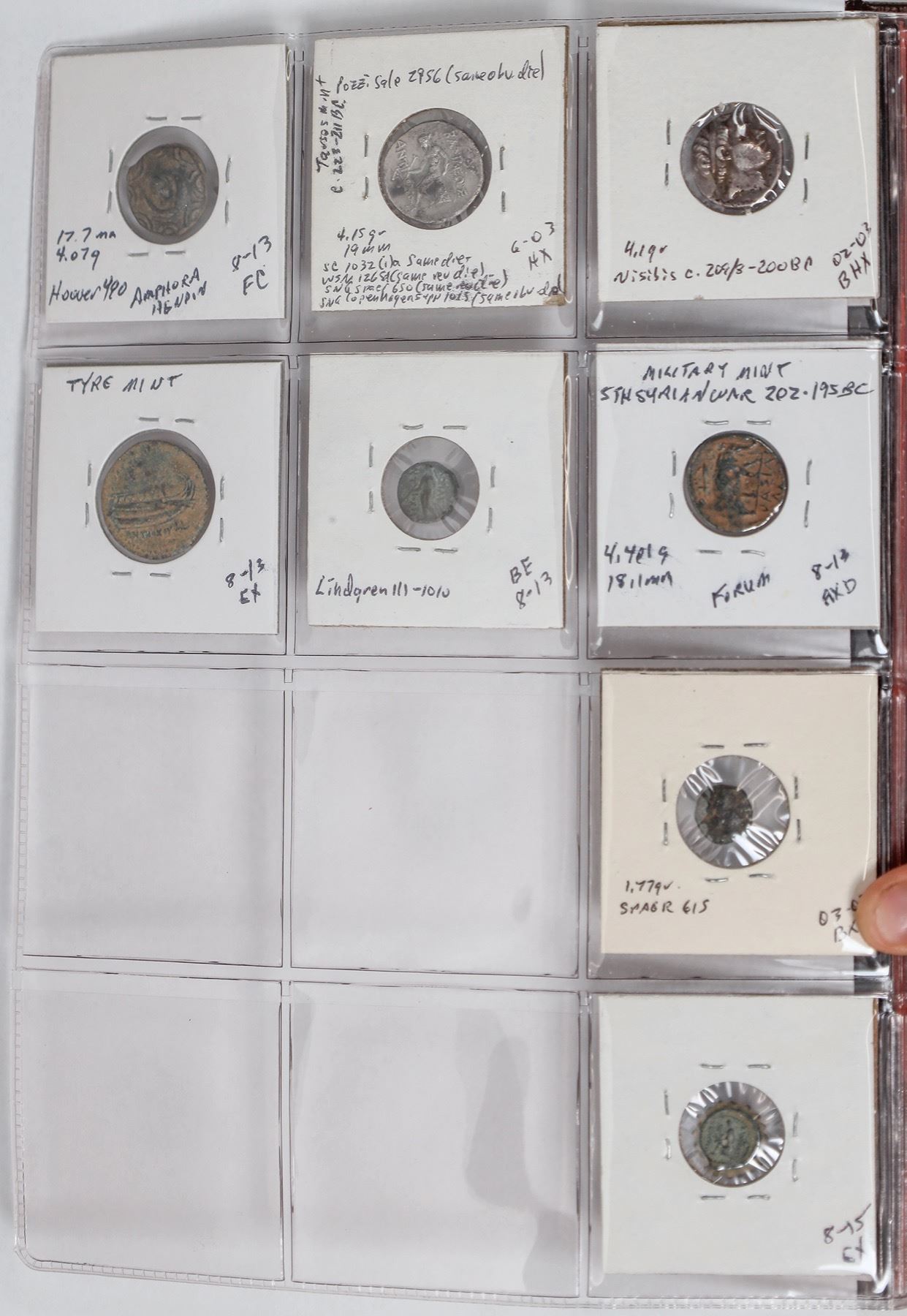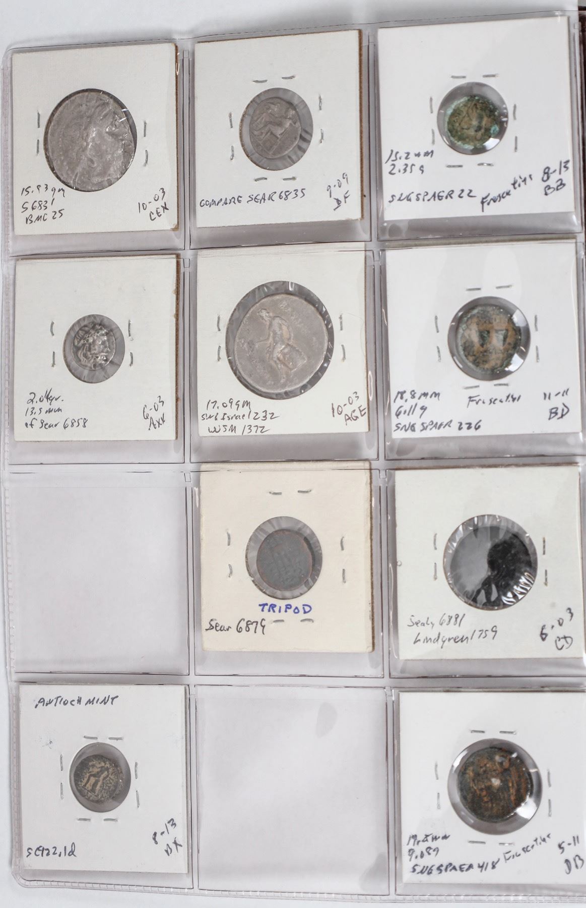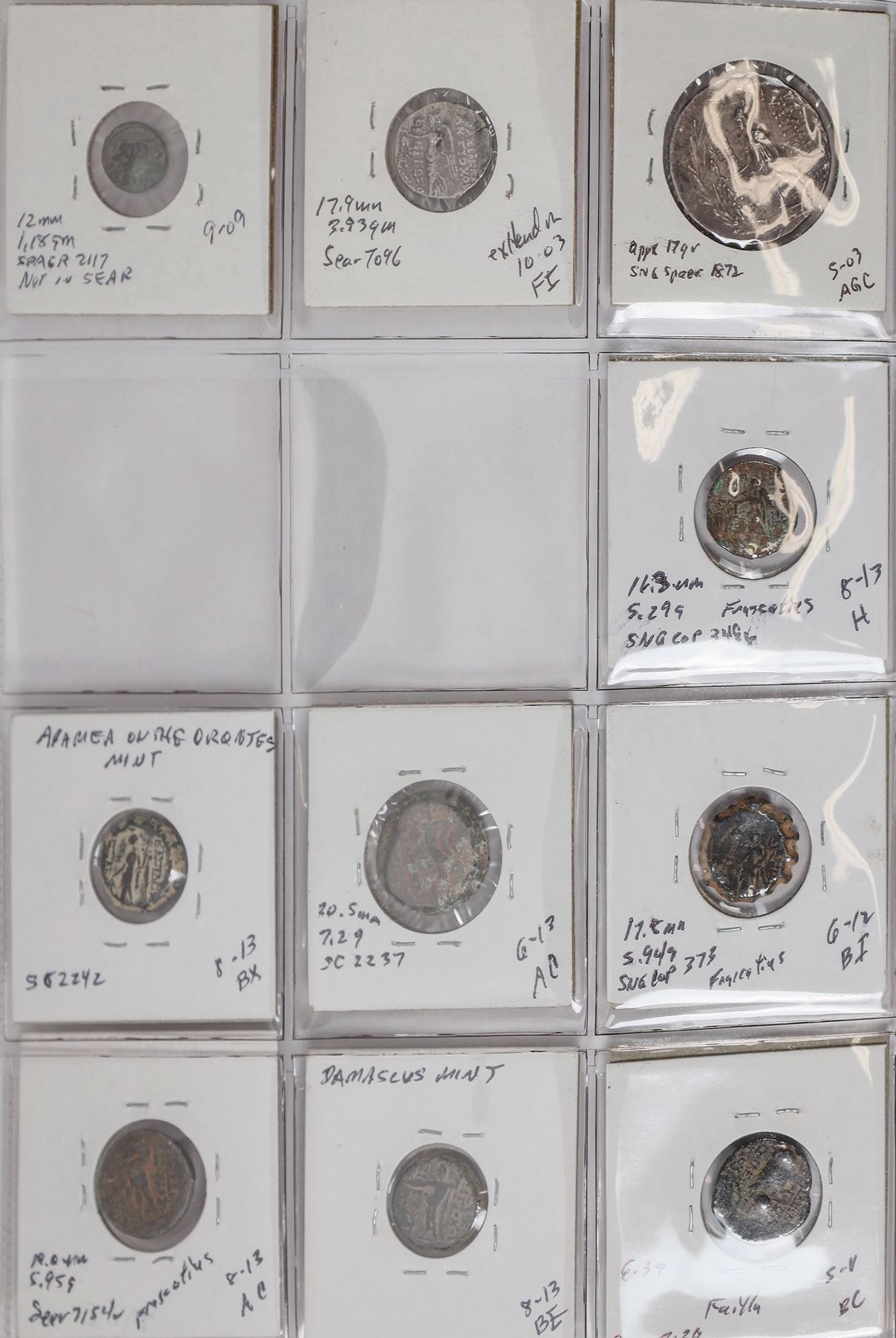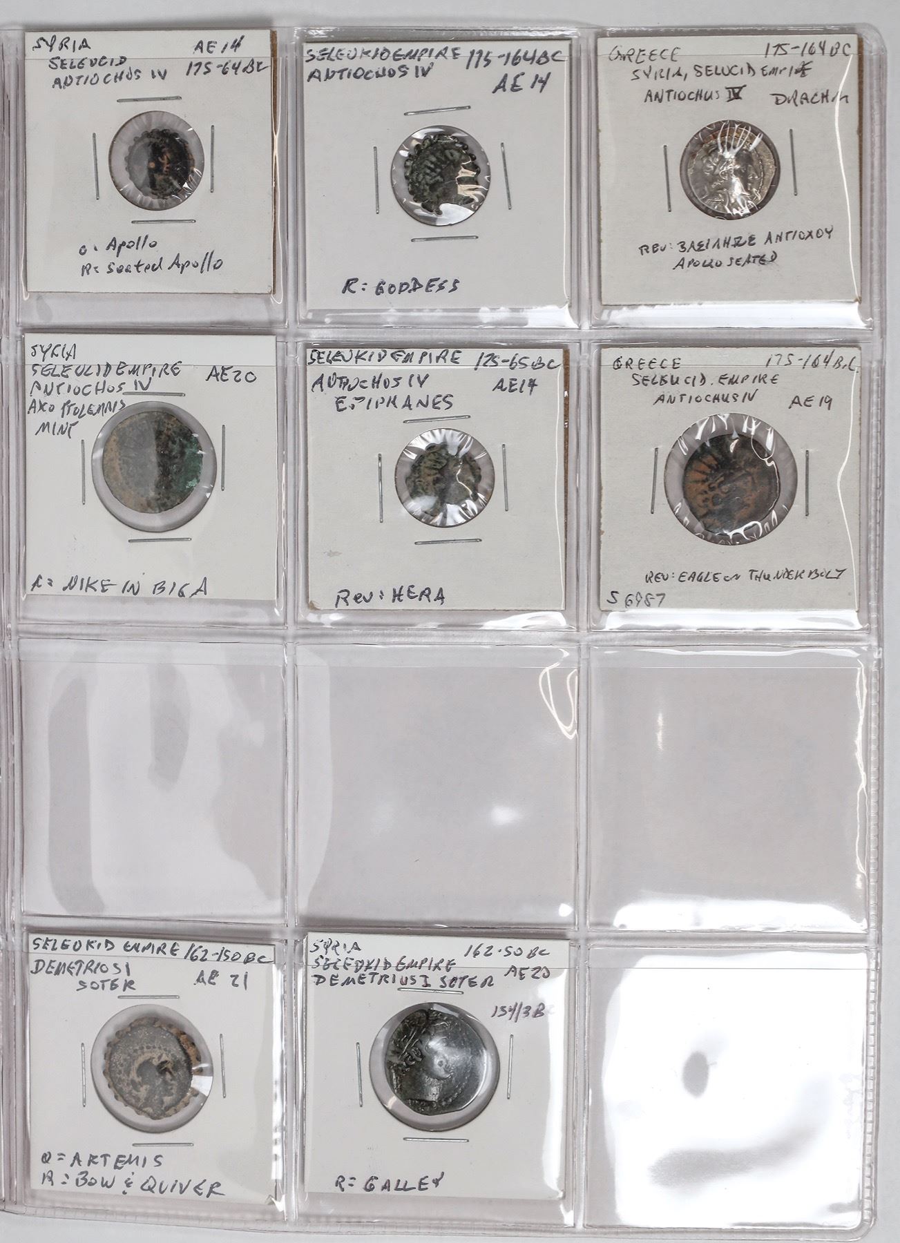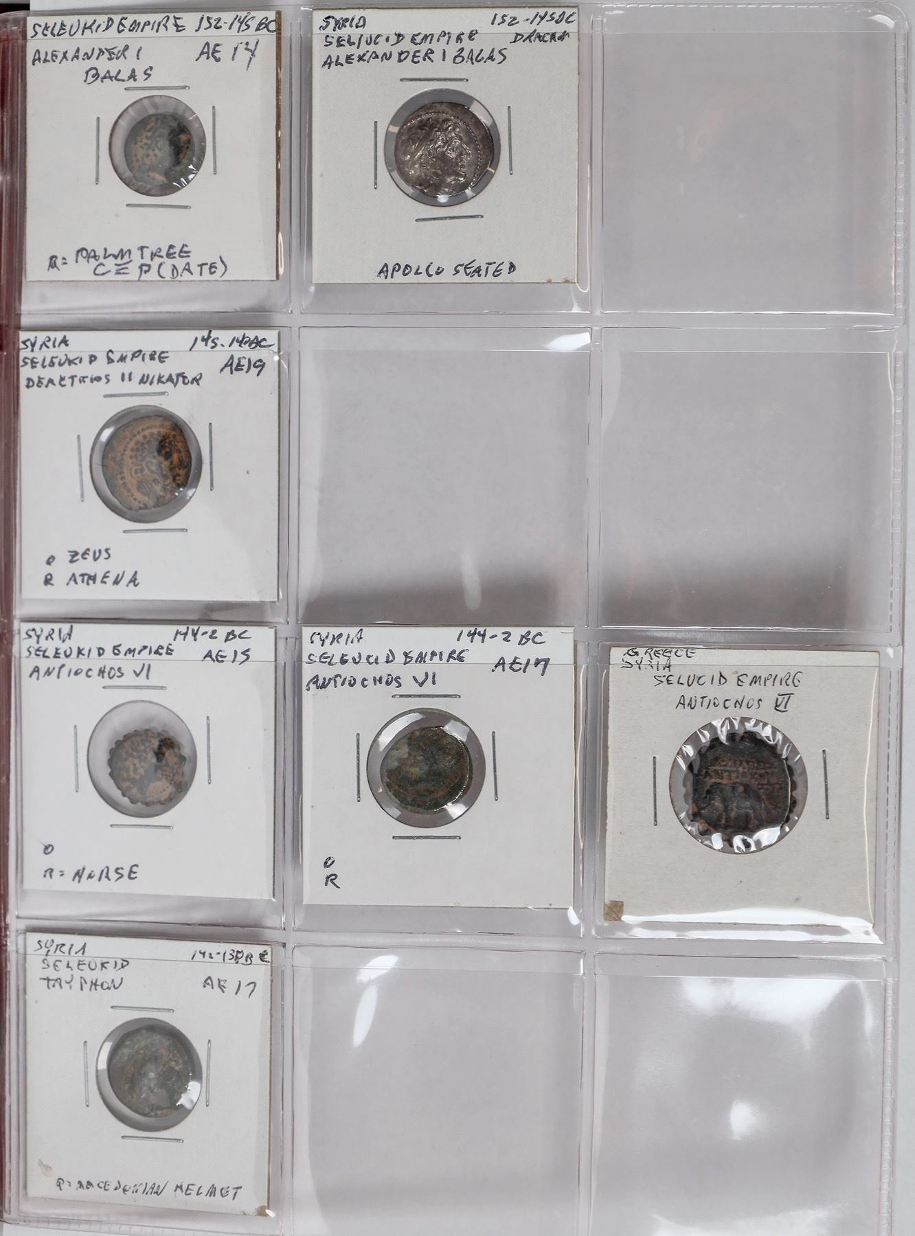 Dansco album #7000 with slipcover with 49 Seleucid coins: 37 bronze and 12 silver coins with 5 tetradrachms. All identified, fine or better including Seleukos II, tetradrachm with elephant. Antochos I, III, IV and Philip Philadelphos.