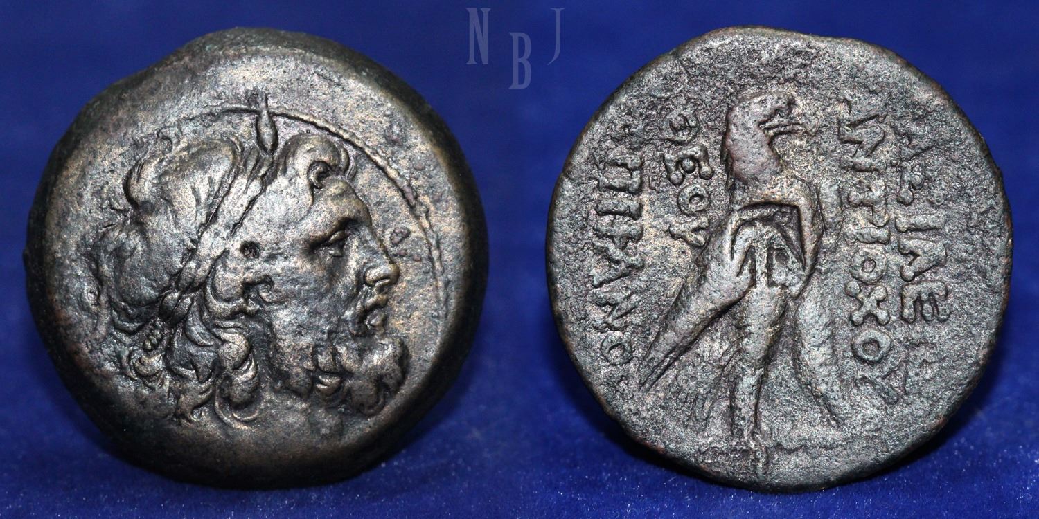 Seleukid Kingdom: Antioch on the Orontes. Antiochos IV Epiphanes 175-164 BC. "Egyptianizing" series. AE Bronze. Laureate head of Zeus-Serapis to right, wearing tainia with Osiris cap at tip. ΒΑΣΙΛΕΩ[Σ] ΑÎΤΙΟΧΟ[Î¥] ΘΕΟΥ ΕΠΙΦΑÎΟΥΣ, eagle standing right on thunderbolt, wings closed, Anchor Countermark In center. (36.70gm, 33mm) Good Fine and Rare.