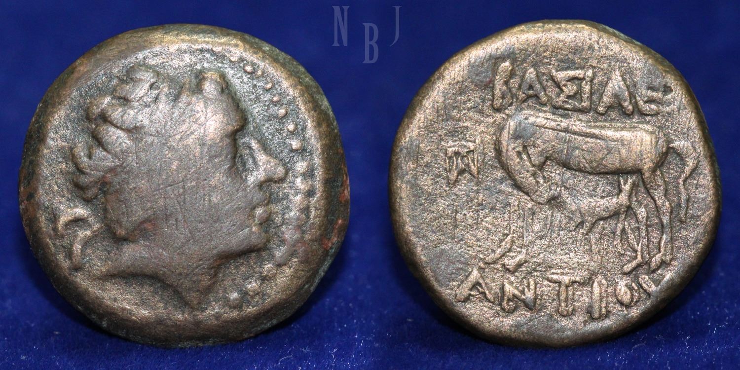 Seleukid Kingdom: Antiochus III the Great, Ecbatana, 211 BC-208 BC, Diademed head of Antiochus lll right (Type B), monogram behind head. BAZINEQZ ANTIOXOY: Mare standing left, head reverted to nuzzle suckling foal, Monogram to left feild. (11.41gm, 24mm) Very Fine and Rare.