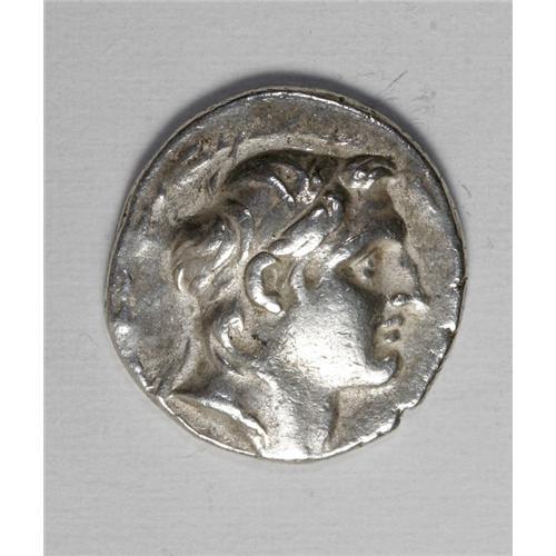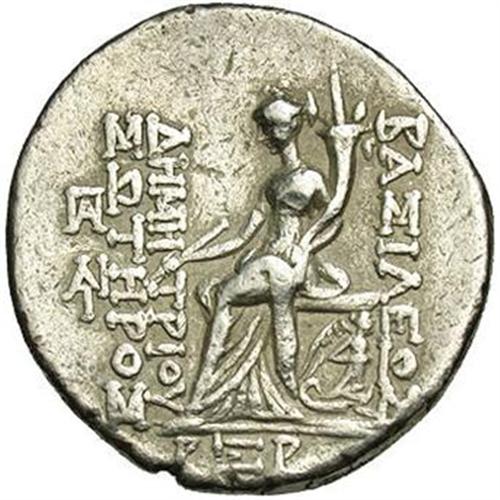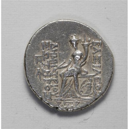 <B>Seleukid Kingdom. Demetrios I Soter.</B></I> 162-150 B.C. AR tetradrachm (27 mm, 16.65 g). Antioch, S.E. 162 (151/0 B.C.). Diademed head right / Tyche seated left, holding baton and cornucopiae, Nereid supporting throne; monograms to outer left, date in exergue. SNG Spaer 1288-90 var. (lower monogram); SMA -. VF.