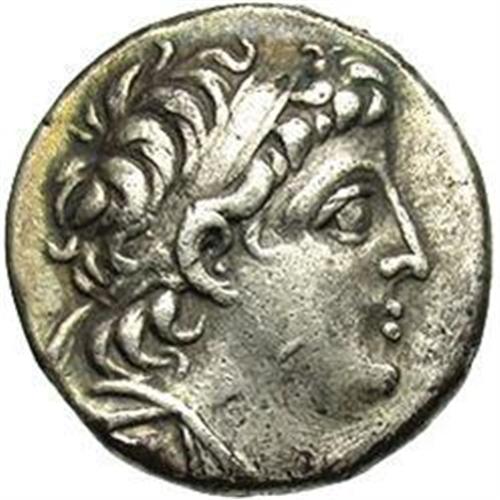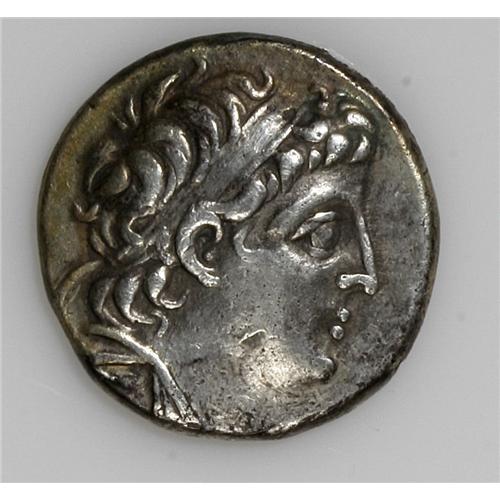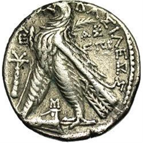 <B>Seleukid Kingdom. Demetrios II Nikator.</B></I> Second reign, 130-125 B.C. AR didrachm (20 mm, 6.99 g). Tyre, S.E. 186 (127/6 B.C.). Diademed head right / Eagle standing left on prow, palm over shoulder; club left surmounted by monogram, letters and date in fields, M between legs. SNG Spaer -; cf. Newell, <I>Tyre</B></I> 116 (tetradrachm). Toned, near VF, light scratches in fields.