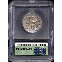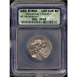 <TABLE cellSpacing=0 cellPadding=0 width="100%" bgColor=#000000 border=0><TBODY> <TR><TD width="100%"><TABLE cellSpacing=1 cellPadding=3 width="100%" border=0><TBODY><TR><TD width="100%" bgColor=#79735c><FONT face=arial color=#ffffff size=3><B>Description</B> </FONT></TD></TR><TR><TD width="100%" bgColor=#ffffff><FONT face=arial size=2><B>Seleukid Kingdom. Demetrios II Nikator.</B></I> Second reign, ca. 130-125 B.C. AR tetradrachm (25 mm). Antioch. Diademed head right / Zeus seated left, holding Nike in outstretched right hand, sceptre in left; O beneath throne. SNG Israel (Spaer) 2162; SMA 320. XF45 ICG. </FONT></TD></TR></TBODY></TABLE></TD></TR></TBODY></TABLE><BR><A name=PricesRealized></A><TABLE cellSpacing=0 cellPadding=0 width="100%" bgColor=#000000 border=0><TBODY><TR><TD width="100%"><TABLE cellSpacing=1 cellPadding=3 width="100%" border=0><TBODY><TR><TD width="100%" bgColor=#79735c><A name=PR><FONT face=arial color=#ffffff size=3><B>Previous Prices from Heritage Auctions</B> </FONT></A></TD></TR><TR><TD bgColor=#f6f6ed>No Prior Data Recorded </TD></TR><TR><TD bgColor=#ffffff><FONT face=arial size=1 ?>PLEASE NOTE: All prices realized reflect the final hammer price PLUS the buyer's premium in auctions that charge a buyer's premium. Each item has a notation at the top of the listing indicating whether that lot included a buyer's premium. Example: A item that sells with a final hammer price of $100 and a 20% buyer's premium will display with a price realized of $120. All information listed is intended to be as accurate as possible, but errors are possible. Please use this guide carefully and inform us of any inaccuracies. </FONT></TD></TR></TBODY></TABLE></TD></TR></TBODY></TABLE><BR><TABLE cellSpacing=0 cellPadding=0 width="100%" bgColor=#000000 border=0><TBODY><TR><TD width="100%"><TABLE cellSpacing=1 cellPadding=3 width="100%" border=0><TBODY><TR><TD width="100%" bgColor=#79735c colSpan=6><FONT face=arial color=#ffffff size=3><B>Price Guide*</B> </FONT></TD></TR><TR bgColor=#f6f6ed><TD align=middle><B>Grade</B> </TD><TD align=middle><B>Coin World<BR>(Trends)</B> </TD><TD align=middle><B>Numismedia<BR>Retail</B> </TD><TD align=middle><B>Numismedia<BR>Wholesale</B> </TD><TD align=middle><B>Coin<BR>Universe</B> </TD><TD align=middle><B>Heritage<BR>Value Index</B> </TD></TR><TR bgColor=#ffffff><TD colSpan=6><FONT size=1>*All information listed is intended to be as accurate as possible, but errors are possible. No item may be returned or refused based on this information which is provided as a service to our customers. You should contact each pricing source directly to determine the accuracy of this information. </FONT></TD></TR></TBODY></TABLE></TD></TR></TBODY></TABLE><BR><TABLE cellSpacing=0 cellPadding=0 width="100%" bgColor=#000000 border=0><TBODY><TR><TD width="100%"><TABLE cellSpacing=1 cellPadding=3 width="100%" border=0><TBODY><TR><TD width="100%" bgColor=#79735c><FONT face=arial color=#ffffff size=3><B>Population Guide</B> </FONT></TD></TR><TR bgColor=#ffffff> Important notice: Heritage usually auctions material at the rate of 200-250 lots per hour. On some occasions eBay Live bid software or the Internet may not be able to keep up with the pace of the auction. We recommend placing a realistic absentee bid now as insurance to avoid disappointment. Occasionally the auctioneer may eliminate or reject an eBay Live bid, and the auctioneer may also reopen a lot after the close of the eBay live bidding (usually because we missed an audience bid), and may reject your bid even if it shows you as the winning bidder. By bidding via eBay Live, you agree that Heritage may award the lot to another bidder at its sole discretion under the circumstances described above or any other reasonable circumstances. Also please note that all Heritage lots purchased through eBay Live carry a 20% Buyer's Premium. Please make sure you read the Terms and Conditions before you bid.</TD></TR></TBODY></TABLE></TD></TR></TBODY></TABLE>