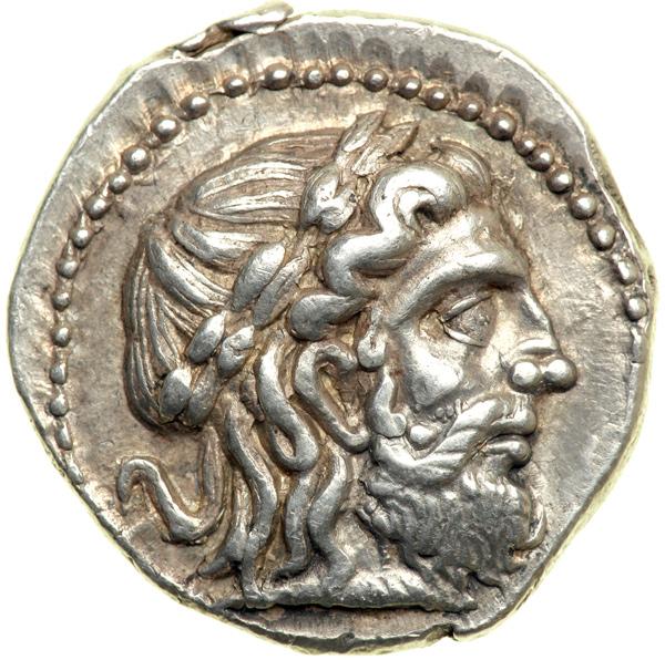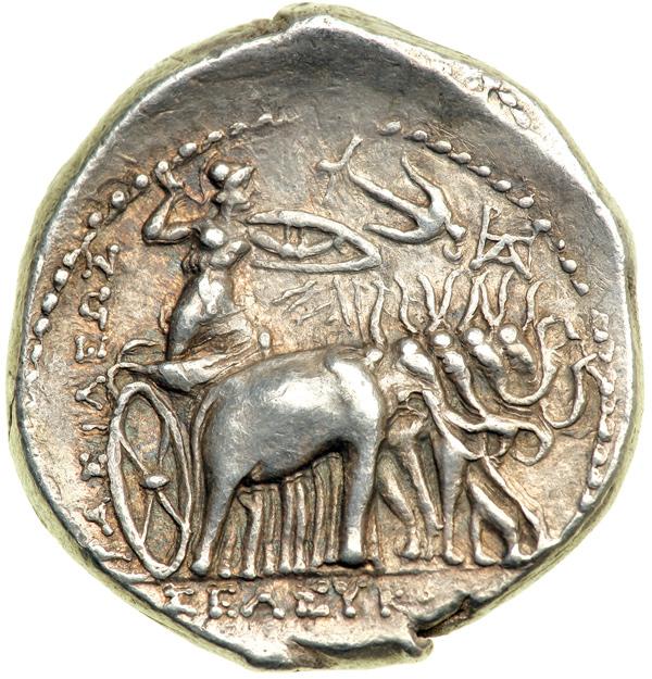 Seleukid Kingdom. Seleukos I, 312-280 BC. AR Tetradrachm (16.94 g) minted at Seleucia on the Tigris (?), c. 296/5 BC. Laureate head right of Zeus. Reverse: Athena driving quadriga of elephants right, brandishing spear and shield; above, anchor and monogram. Houghton & Lorber (Seleucid Coins, Part I) 130.25; Newell (WSM) 1626. Extremely Fine. .