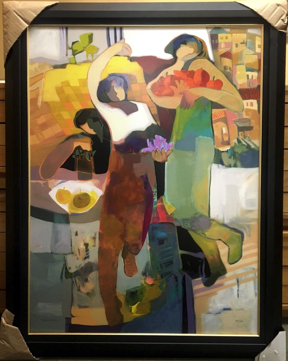 As in all of his vintage Collectors editions pieces , Hessam Abrishami ‘s limited edition giclee on canvas called “Self-Expression”, speaks of the artist’s love for laughter and dance , color and movement , love and romance . Unframed it measures 40x30” , but this one is in a tastefully matt black molding with a black linen liner and gold filet . The outer frame shows a few spots of age , normal wear and tear , but nothing that would detract from the piece .Giclee on Canvas Piece # TP 2/3 Framed Size 46x36"