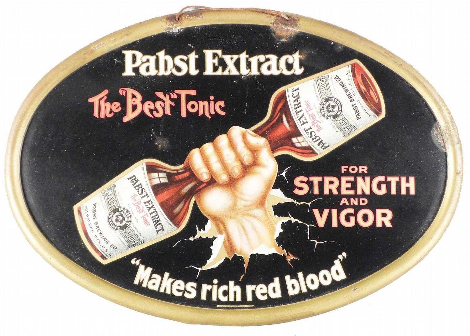 Self Framed Tin Sign For Pabst Extract string hanger. Entitled, "Makes rich red blood". Chas. W. Shonk Co. Lithographer, Chicago. Some rust at 11/1/3:00 and a small blemish under the word best otherwise good condition. 13 1/4 X 9 1/4 inches.