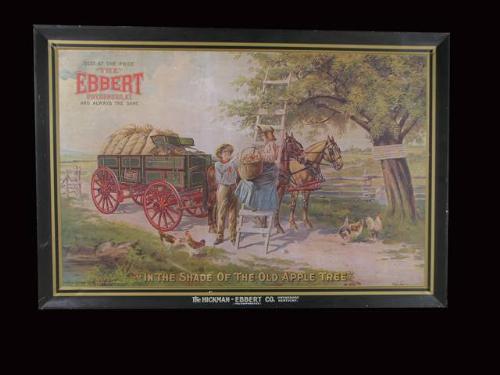 Tin self-framed lithograph advertising for The Hickman-Ebbert Co. entitled (In the Shade of the Old Apple Tree), 23 inches x 34 inches, good condition.